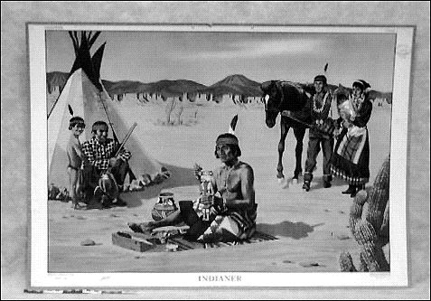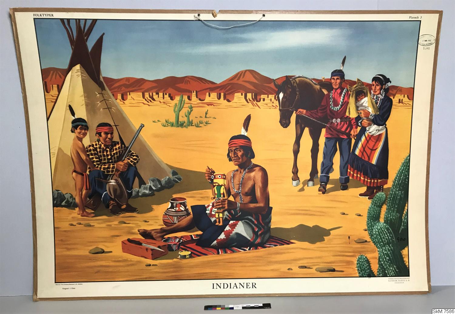 Motiv:"Indianer", polykrom bild.Serie: Folktyper plansch 3. Bilden signerad "I Gero". Text på baksidan se bilaga i pärm. Hack i övre kanten.