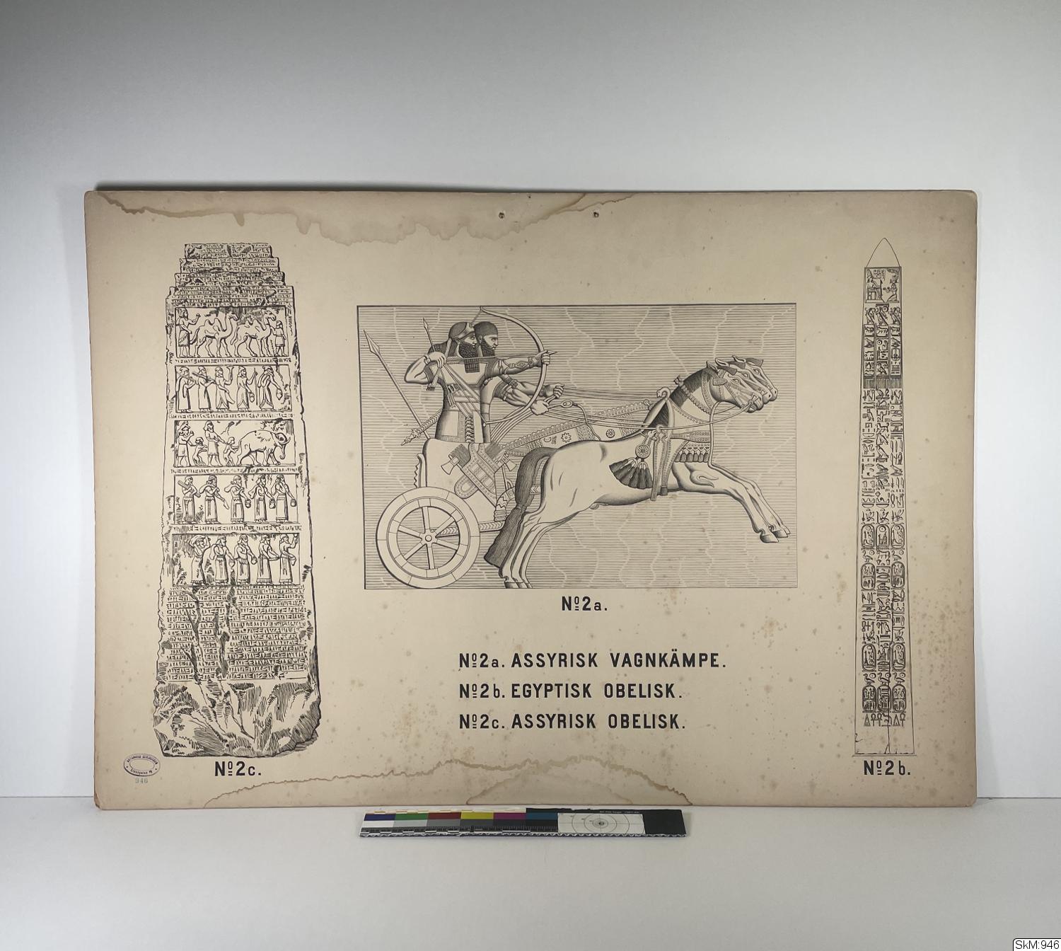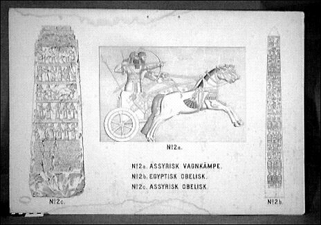 Motiv: Assyrisk vagnkämpe egyptisk obelisk assyrisk obelisk, svart/vit. Serie: No 2a 2b 2c Tavlor ur den allmänna historien. Redaktör/Tillverkare: Ernst Carlson L. Baltzer. Något fuktskadad framför allt längs kanterna.Enstaka fläckar. Stötta hörn.