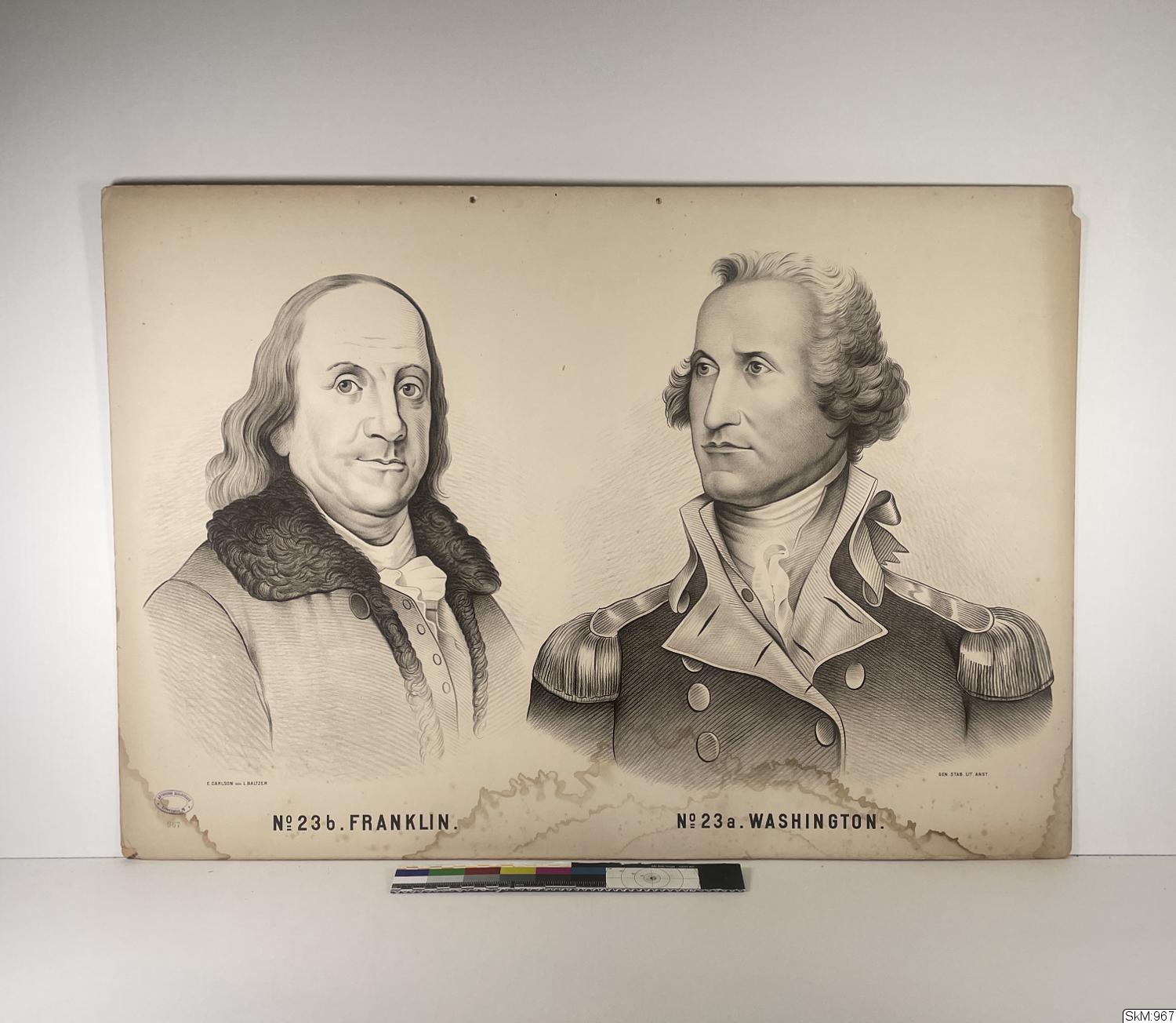 Motiv: Franklin Washington, svart/vit. Serie: No 23a 23b Tavlor ur den allmänna historien. Redaktör/Tillverkare: Ernst Carlson L. Baltzer Fuktskadad längs undre kanten och fläckig. Stötta, trasiga hörn.