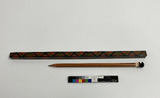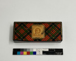 • Blyertspenna med träfodral och frimärksask med skotskrutigt mönster.