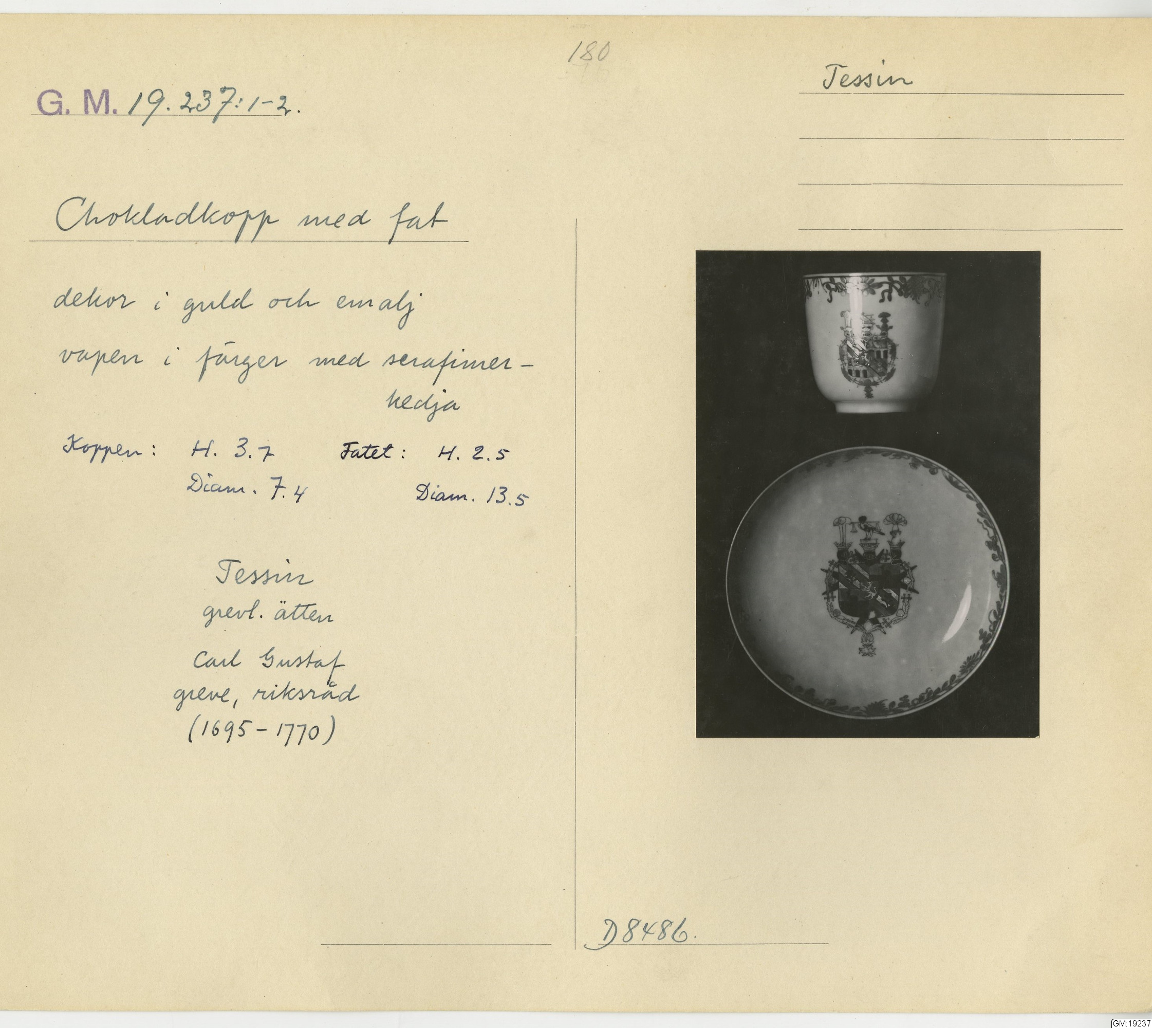 • Chokladkopp med fat. Vapen: Tessin, blomsterbård i guld.