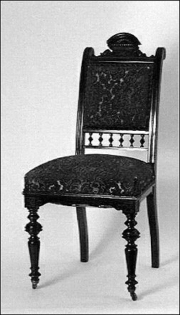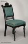 Stolar (6 st), tillhörande förmaksmöbel av skulpterat och svartpolerat päronträ. Stoppade och klädda. Ryggstöd och sits, gröna växtmönster.#Överstycket snidat, balusterad på nedre delen av ryggstödet, svarvade framben.#På bilden visas endast 1 st.
