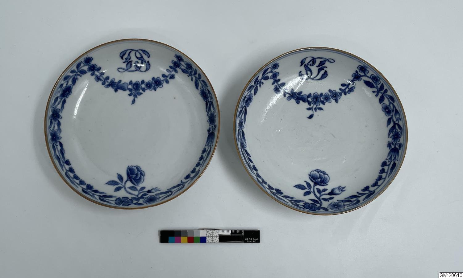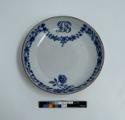 • Fat med blå blomsterdekor, monogram D.S, brun kant. För bild se GM 20 608, GM 20 609.#af Sandberg.