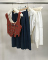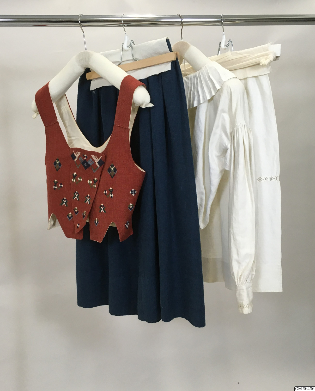 • Bohusdräkt bestående av livstycke, kjol, blus, förkläde och bindmössa.