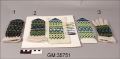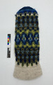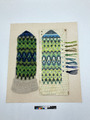 Tre uppstickade tumvantar i olika varianter med tillhörande stickmönster från Bohus stickning. :1 tumvante, beige, med mösterstickning i vitt, två bruna, två gröna och tre blå nyanser på ovansidan. :2 tumvante, beige, med mönsterstickning i vitt, tre gröna, och tre blå nyanser på ovansidan. :3 fingervante, beige, med mönsterstickning i vitt, tre gröna och tre blå nyanser på ovansidan. :4 arbetsri...