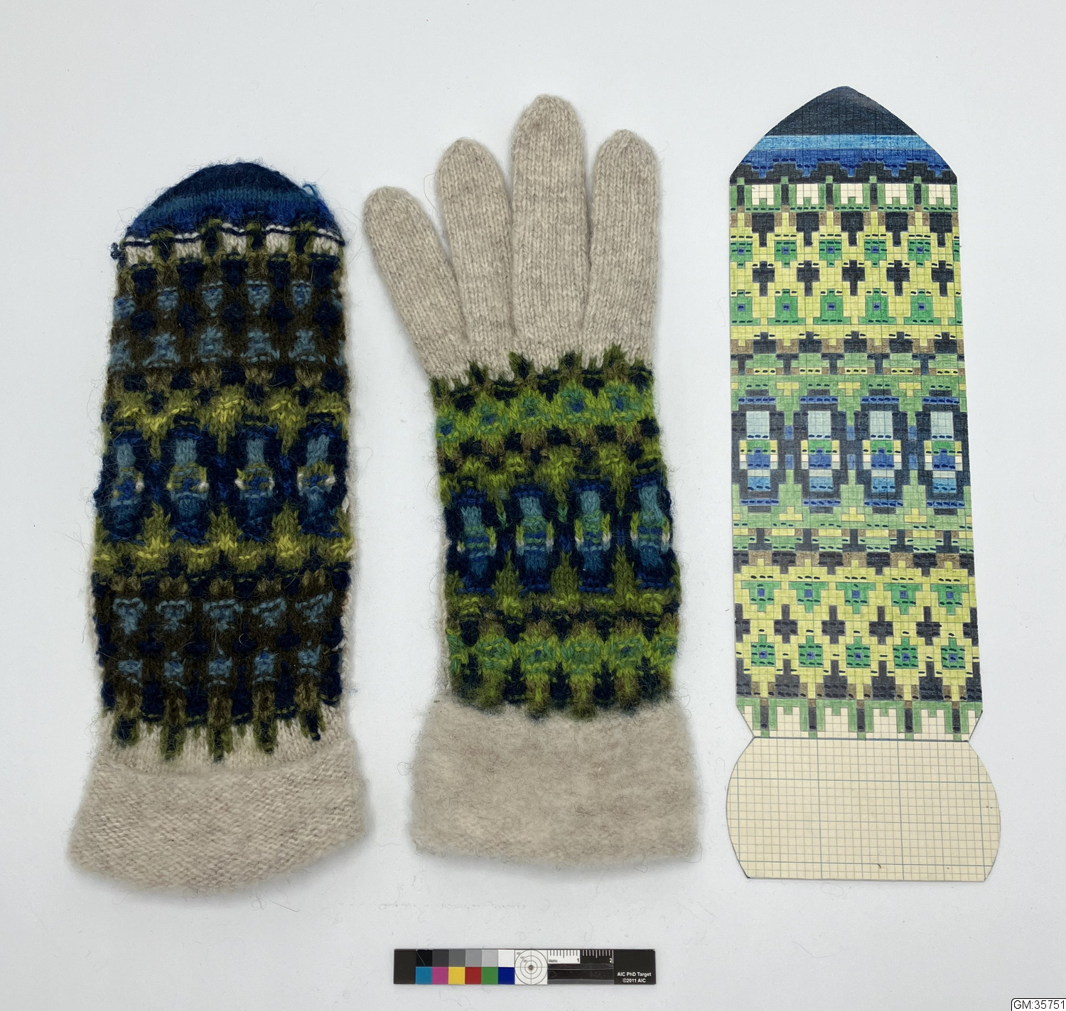 Tre uppstickade tumvantar i olika varianter med tillhörande stickmönster från Bohus stickning. :1 tumvante, beige, med mösterstickning i vitt, två bruna, två gröna och tre blå nyanser på ovansidan. :2 tumvante, beige, med mönsterstickning i vitt, tre gröna, och tre blå nyanser på ovansidan. :3 fingervante, beige, med mönsterstickning i vitt, tre gröna och tre blå nyanser på ovansidan. :4 arbetsritning med garnprover till nr. 2 och nr. 3. :5 arbetsritning