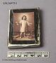 1) Rektangulär karamell med silverfärgat papper. Påklistrad bild med Jesus som barn med kors, kalk och törnekrona. Svart ram. Handskrivet på baksidan: "Från Pappas Begrafning." Minne av givarens mormor, Agnes f, Fleetwood, far Georg Fleetwood, död 1878.