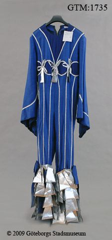 "Hel dress i blått tyg 170 cm lång, dekorerad med silverband och med silverskinn. Dräkten har en "sjömanskrage" av mörkare blått och runda dekorationer på bröst och rygg av mörkare blått tyg. Ärmarna är vida och skurna i snibbar.