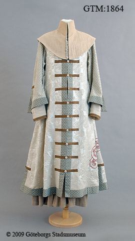 Teaterdräkt i form av långärmad kappa med påsydd krage. Knäppning mitt fram med hjälp av kardborreband, ihopsydd nertill fram. Innerärmar samt innerdräkt sytt i växtfiber, yttertyget av syntetbrokad med applicerat mönster i vänster sida nertill. Etikett på insidan: "GÖTEBORGSOPERAN, PROD. Boris G..., Namn: Jonas Landström". /lzg 2012-10-19 Efter en enklare sökning i Stadsmuseets arkiv hittades information om vilken uppsättning dräkten är från, om ej kortfattad: "Boris Godunov, GO, Prem. 2005-04-16, P.R". /lzg 2012-11-08