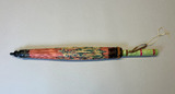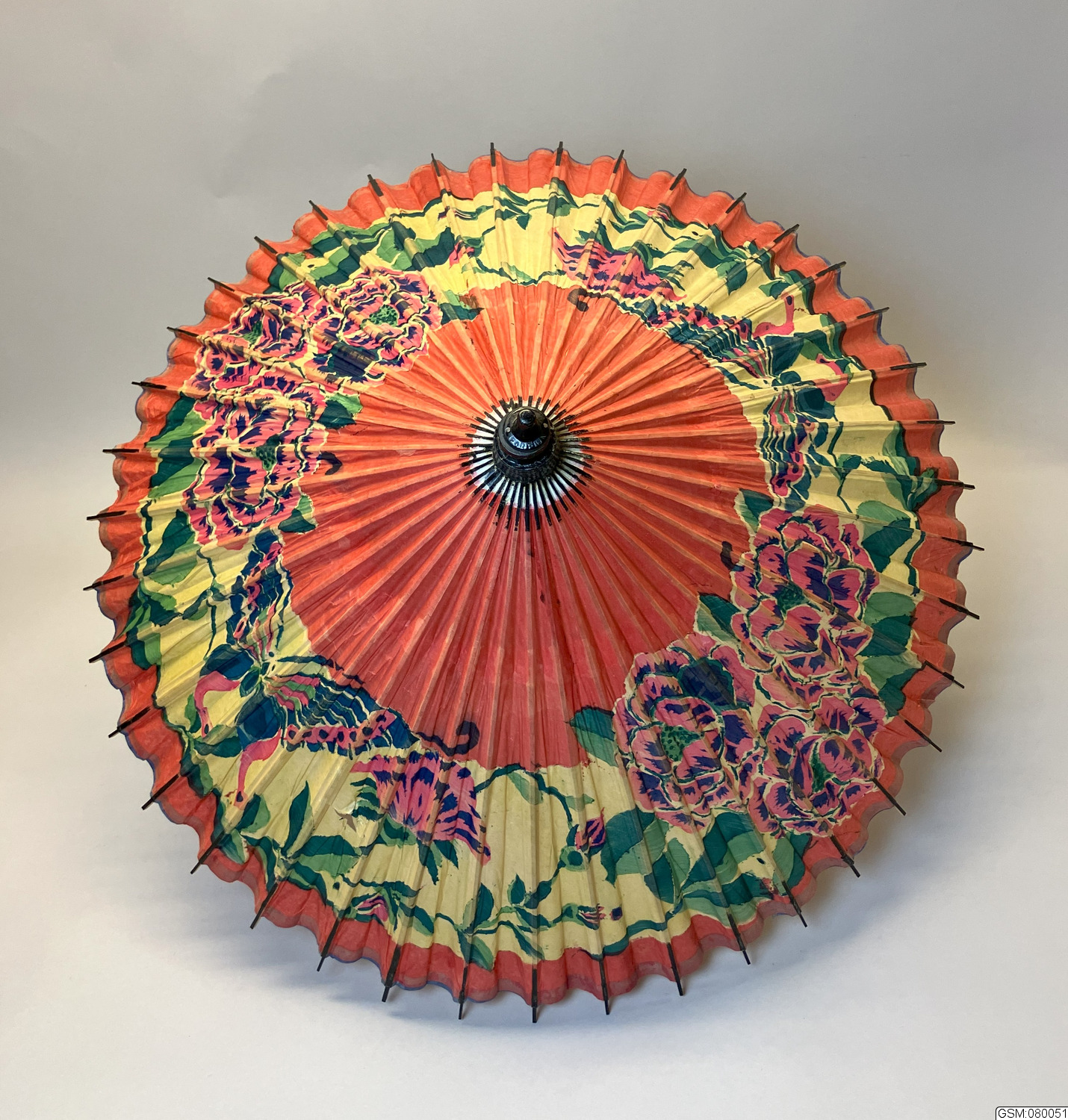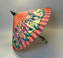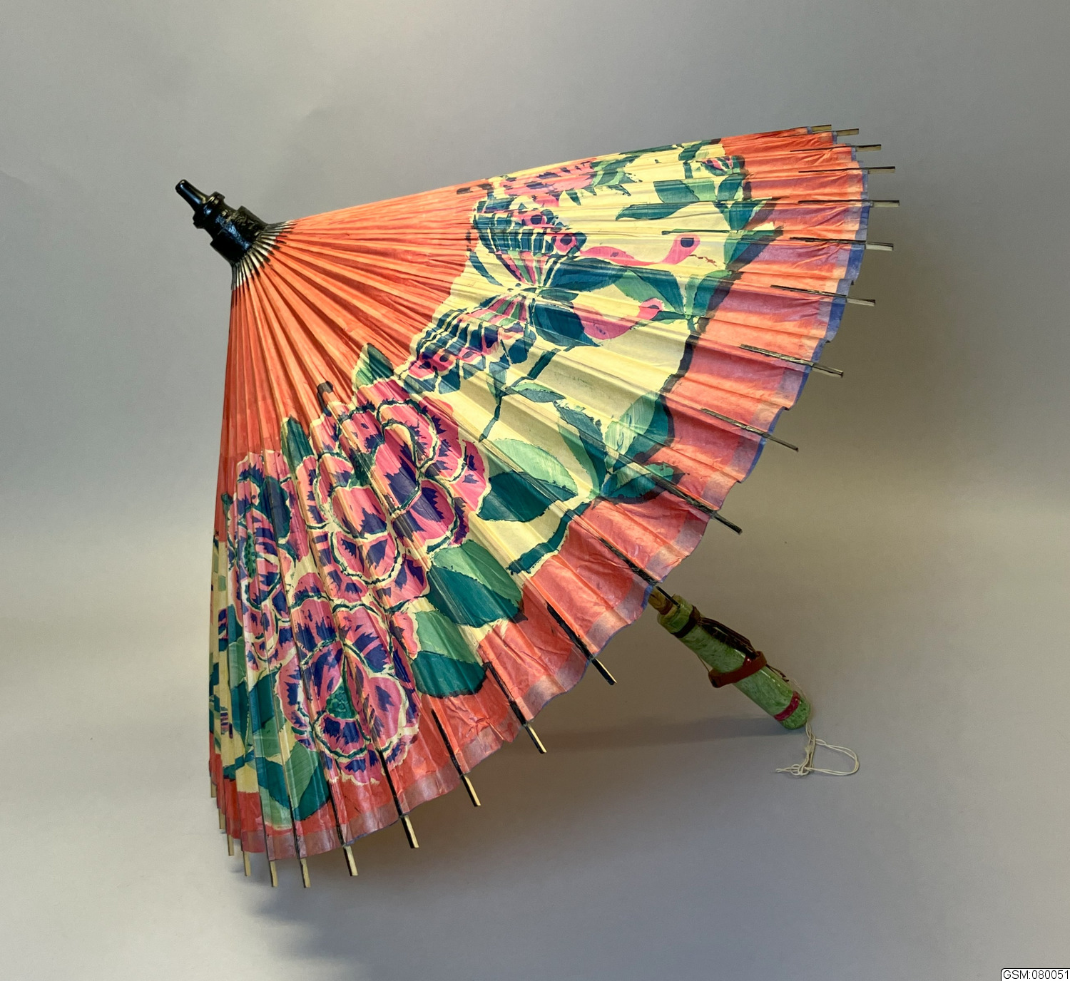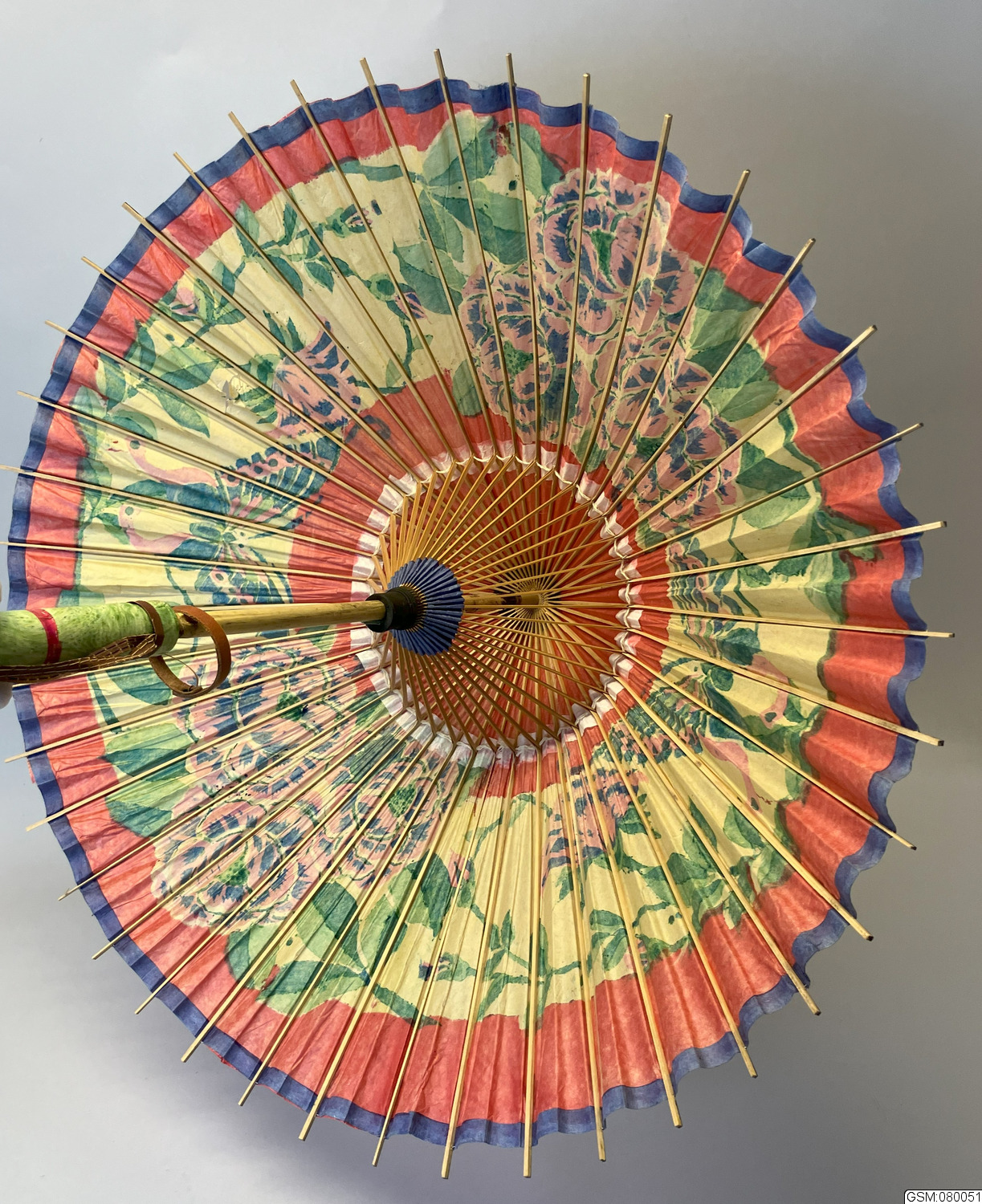 Parasoll, Asiatiskt av målat papper och bambu. Med skaft och spröt av bambu samt handtag av målat trä och skärm av papper. Skärmen är troligen schablontryckt mönstret föreställrt blommor och fjärilar.Troligen från 1920 tal då parasoll av den här typen var en mycket populär accessoire att ha under soliga dagar.