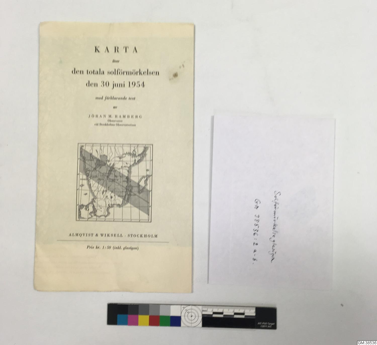 Karta över den totala solförmörkelsen den 30 juni 1954 med förklarande text av Jöran Ramberg, Observator vid Stockholms observatorium. Almqvist & Wiksell, Stockholm. Pris 1:50 (inkl. glasögon).