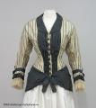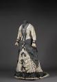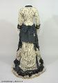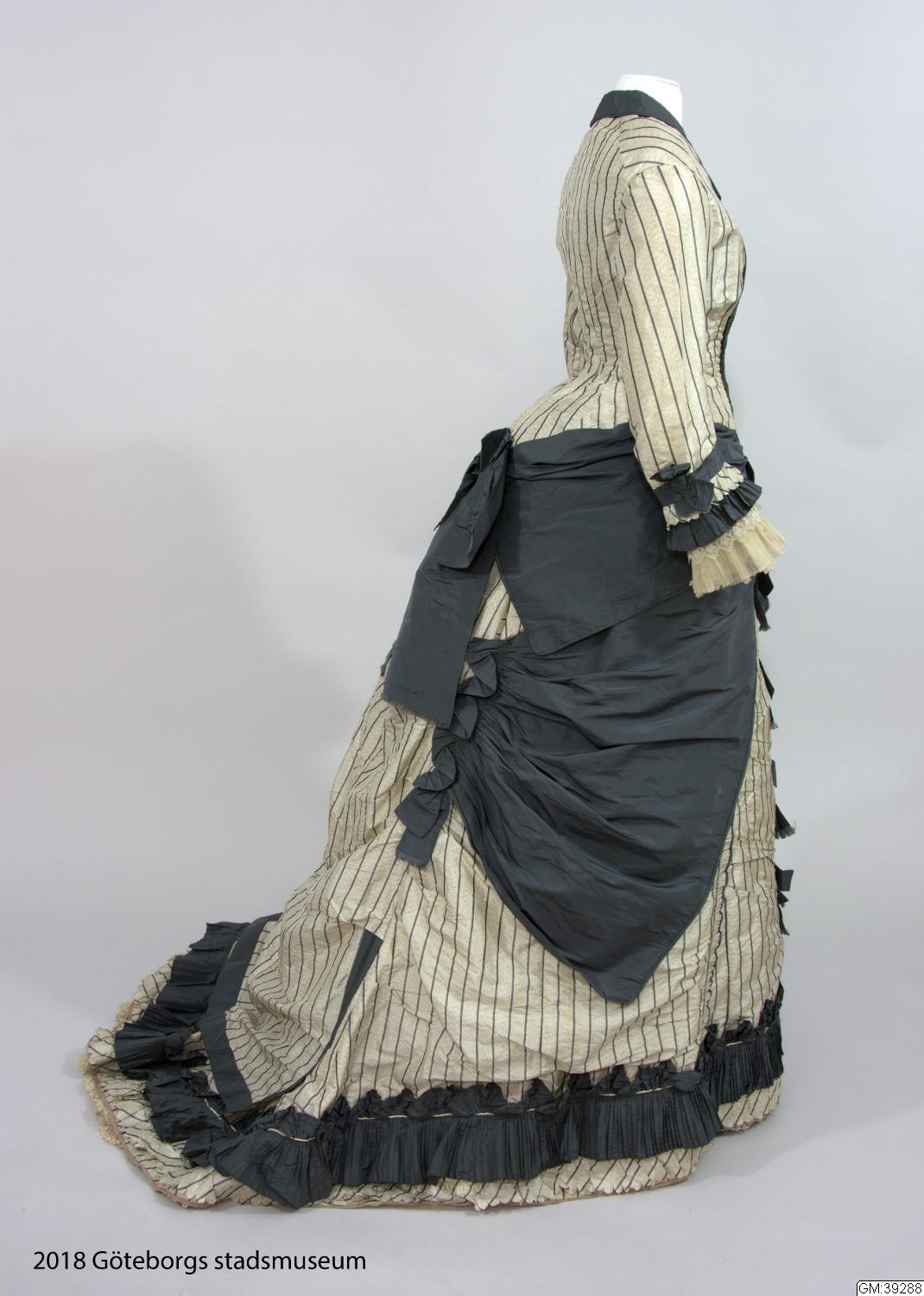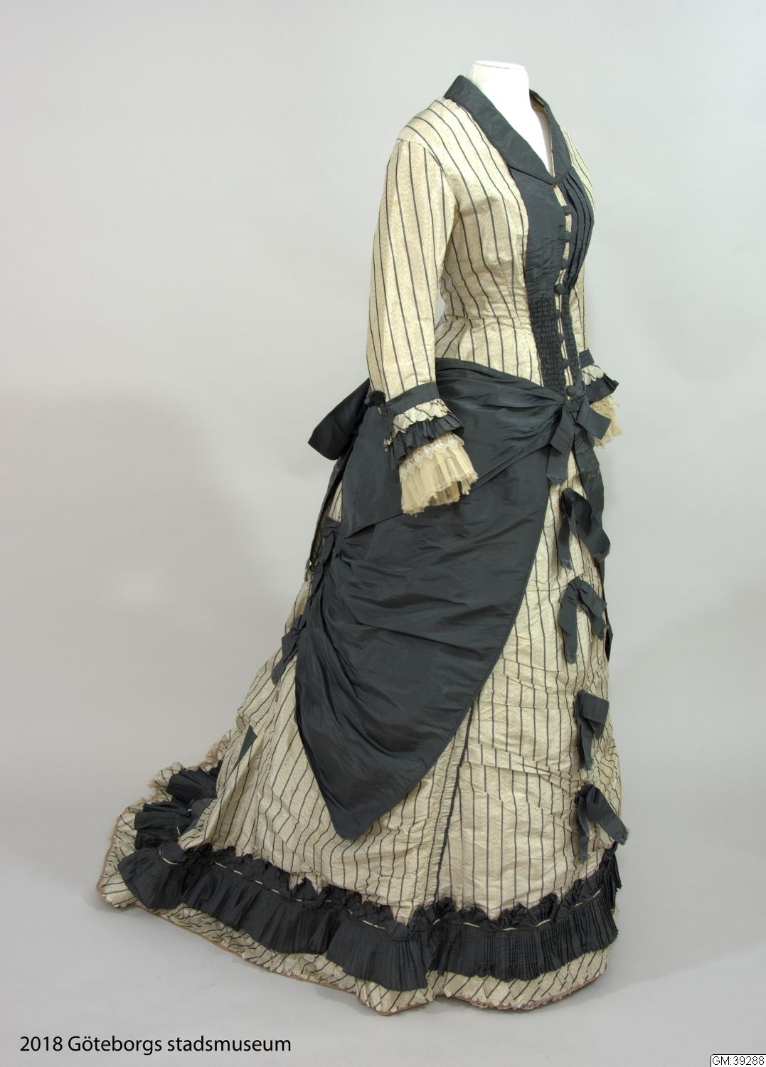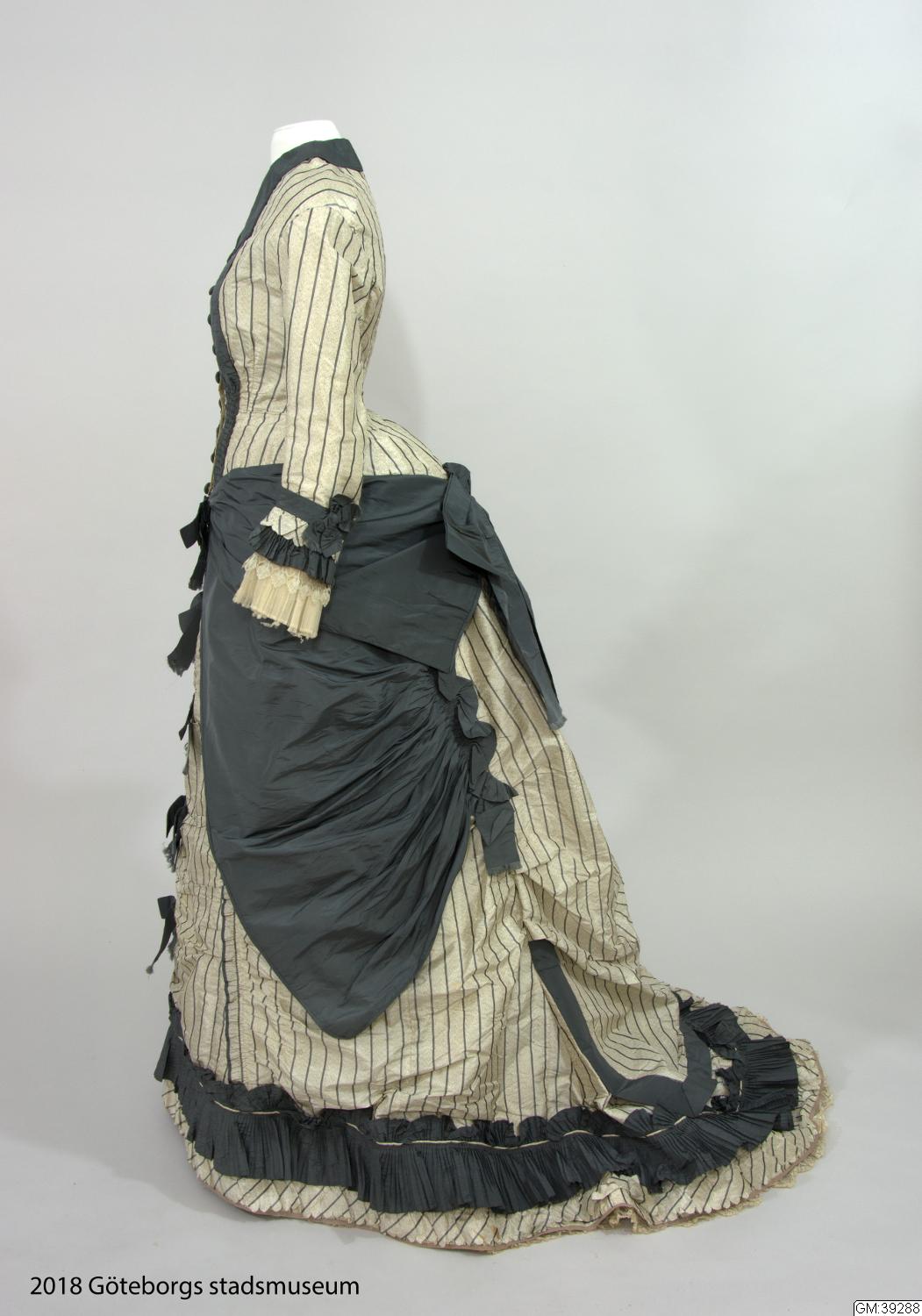 Klänning i tre delar av vit, något spräcklig sidentaft med smala grå ränder. Det första livet som är äldre har vid urringning och kort ärm och dekorerad med svart och vit spets. Det andra livet är långt, med lång ärm och knäppning mitt fram och ett skört som draperas över kjolen och har dekorationer och draperingar i grå taft som hör samman med kjolen i stil och dekor. Kjolen är draperad med släp...