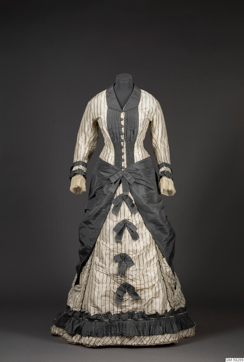 Troligen använts av Fredrique Melin, f. Meyer, Tyskland (1818-1901). Gift med grosshandlare Adolf Wilhelm Melin (1808-1897), Peder Waern & Co, boende på landeriet Olivedal. Klänningen syddes troligen upp på 1860-talet med två liv, ett kortärmat och urringat för aftonbruk och ett långärmat med hög knäppning för vardagsbruk. Det långärmade livet hade troligen en vidare ärm och saknade troligen dekorationer annat än möjligtvis en smal spets längs med halsringning och ärmslut. Kjolen var då troligen sydd efter tillhörande mode med stor vidd utan särskilda dekorarioner för att bäras över krinolin. Klänningen har sedan sytts om ca 1875 för efter dåtidens mode med turnyr och draperingar på kjolen. Att sy om sina kläder var det vanliga att göra vid denna tid för textil var dyrbart och återanvändes därför på olika sätt. Här har sytt om kjolen för att passa den nya siluetten med turnyr och använt överskottet av tyg tack vare den stora vidden i den första kjolen för att kunna göra ändringar med förlängt liv och draperingar och dekorationer på kjolen. Man har även använt tyg av grå sidentaft och gas till dekorationer som är typiska för stilen. Det kan noteras att det äldre livet är dekorerat i svart och vit spet och inte i grått som den blev senare. /Anna Adrian 2018-10-03