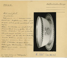 Bålskål med fat, bilden visar endast fat. Av ostindiskt vitt porslin med målad dekor. Utvändigt: draperibård i lila och guld runt kanten, sköld med namnet "Ellsbo" omgiven av små gula blommor och gröna blad. Invändigt: bladranka i guld och grönt runt kanten.
