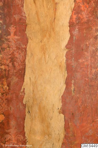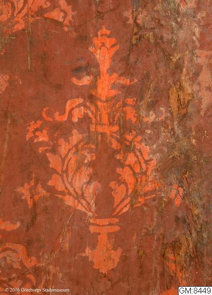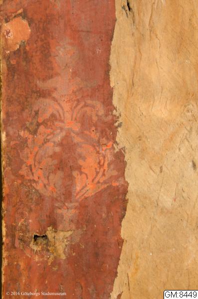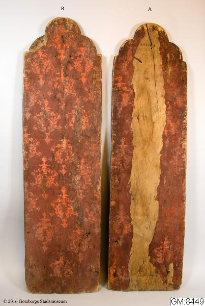 Trätekniker: Dörrar Skurna i ljust lövträ där ämnet består av en ur stocken tangiellt spräckt,lätt välvd, planka ca 50mm tjock.Ämnet har bearbetats i ett stycke med både raka och skålformade järn.Kanterna har planhuggits med rakt järn. Dörr A ha en 370mm vertikal spricka i överdelens trepassbåge som har lagats genom att en dymling slagits in från sidan,sprickan har därefter fyllts med väv och träkilar innan grundering påförts. Detta tyder på bearbetning i färskt trä. Baksidan på dörrA har planhuggits sekundärt varvid den schablonerade dekoren utplånats,möjligen med syfte att få den plan i samband med ny montering.Båda dörrarna har handsmidda järnnaglar islagna troligen eftertidig sekundär montering. Ytbehandling: Sprickor och ojämnheter överklistrade med grov väv,delvis sekundär.Minst tre ommålningar förekommar 1) möjligen 1400-tal; Blått- Matt, kornig (Azurit) på gråsvart undermålning i de nedsänkta fälten. Rött- I två skikt,det undre ljust rödorange matt,det övre semitransparent klart rött,på ramverk. Metall- Glansförgyllning på tunn ljust brunorange bolus,på nedsänkta korsblommor Baksidan har strukits med en tunn matt fuktkänslig brunröd färg (Caput Mortum) limfärg,under denna syns en tunn svart färg struken direkt på träytan.Dekor i form av schablonerat mönster i granatäppleform med bladornamentik.Färgen varierar i tjocklek har matt ytkaraktär och rödorange mönjeton. 2)Svart och grön halvfet oljefärg samt delvis oxiderad mattförgyllning. 3) Tjock gråvit oljefärg.