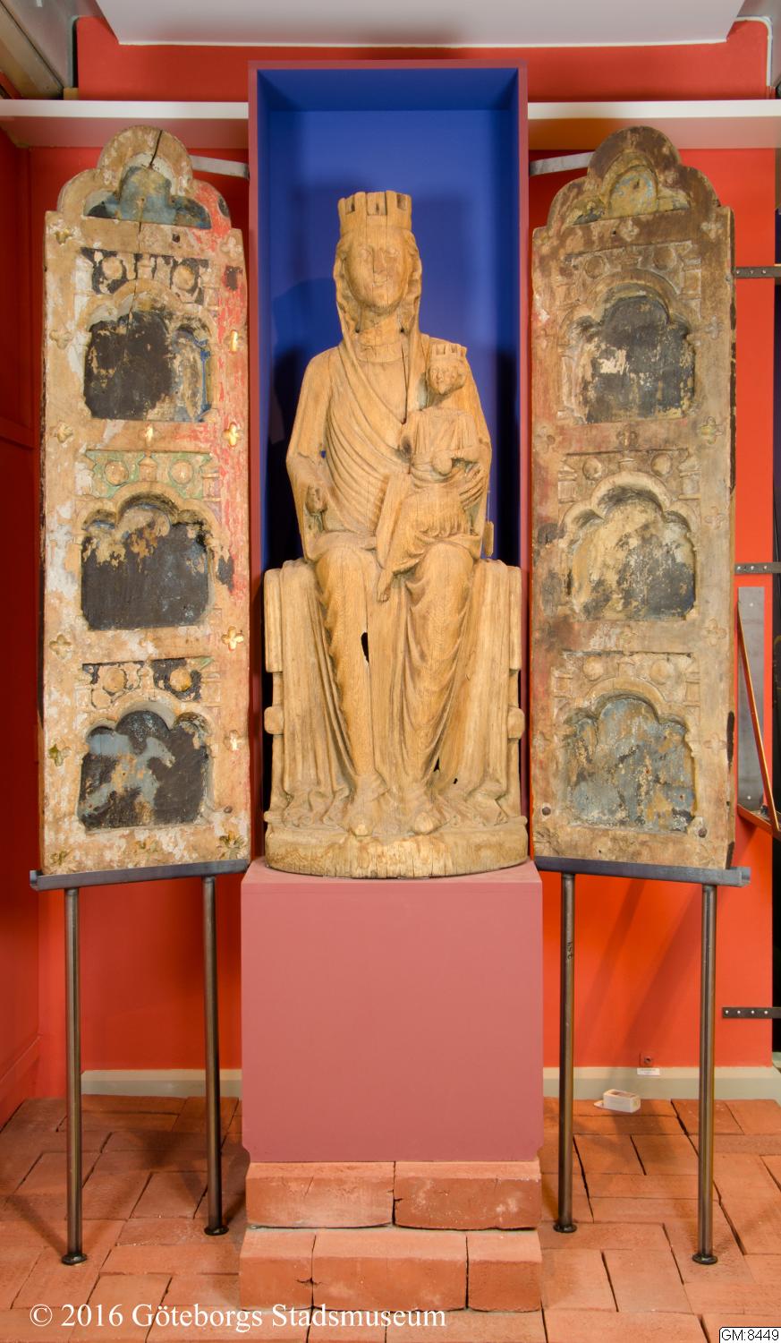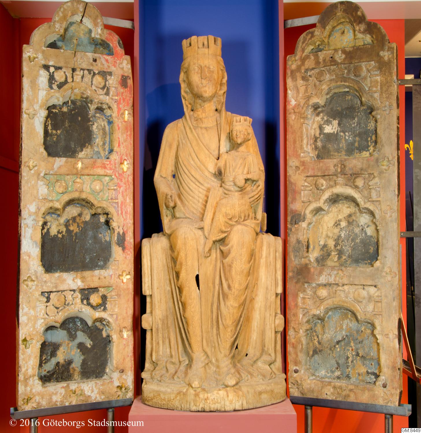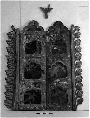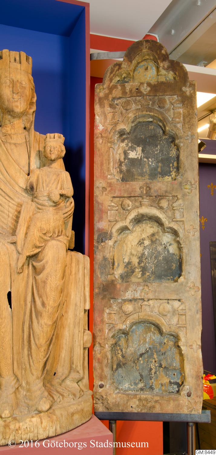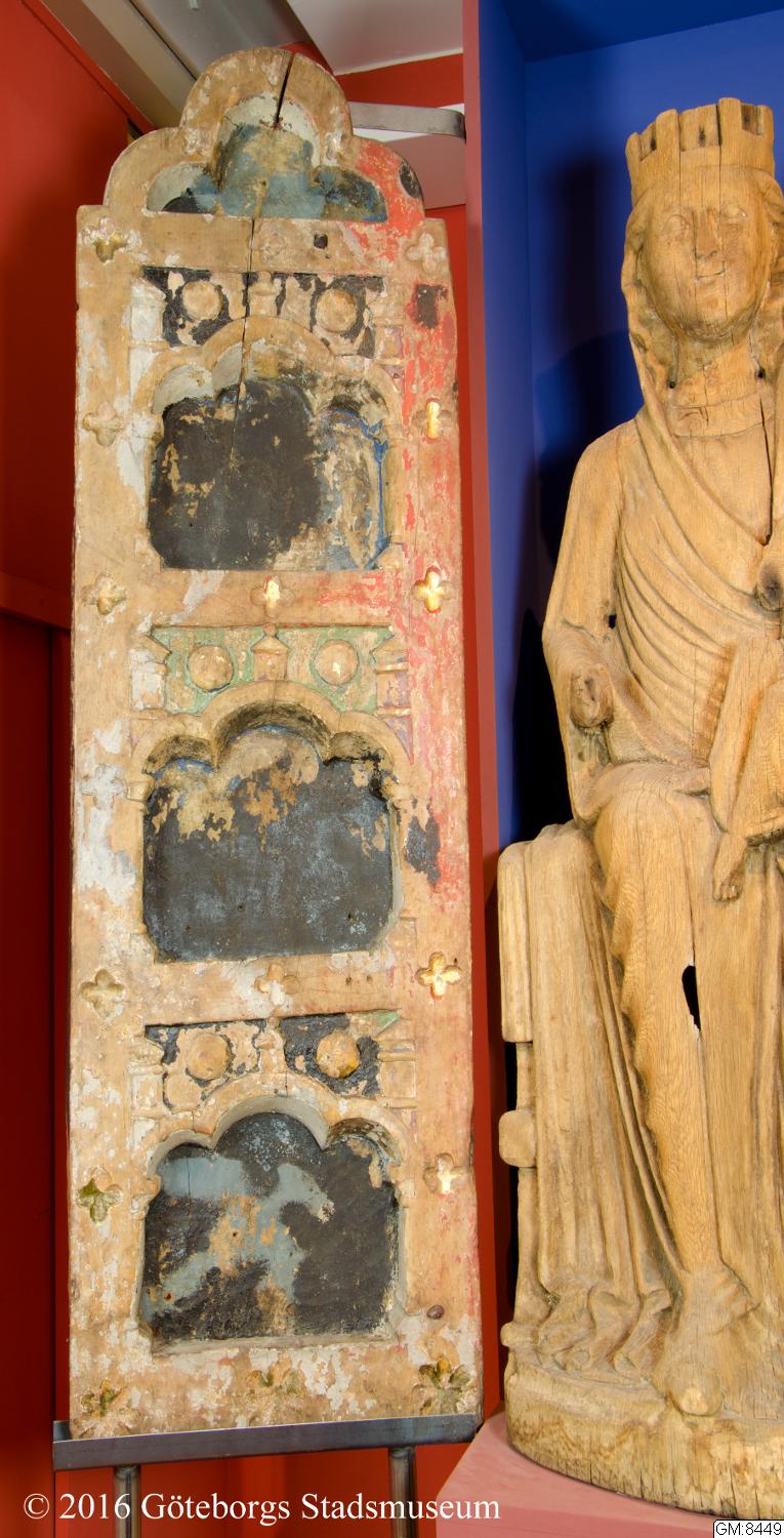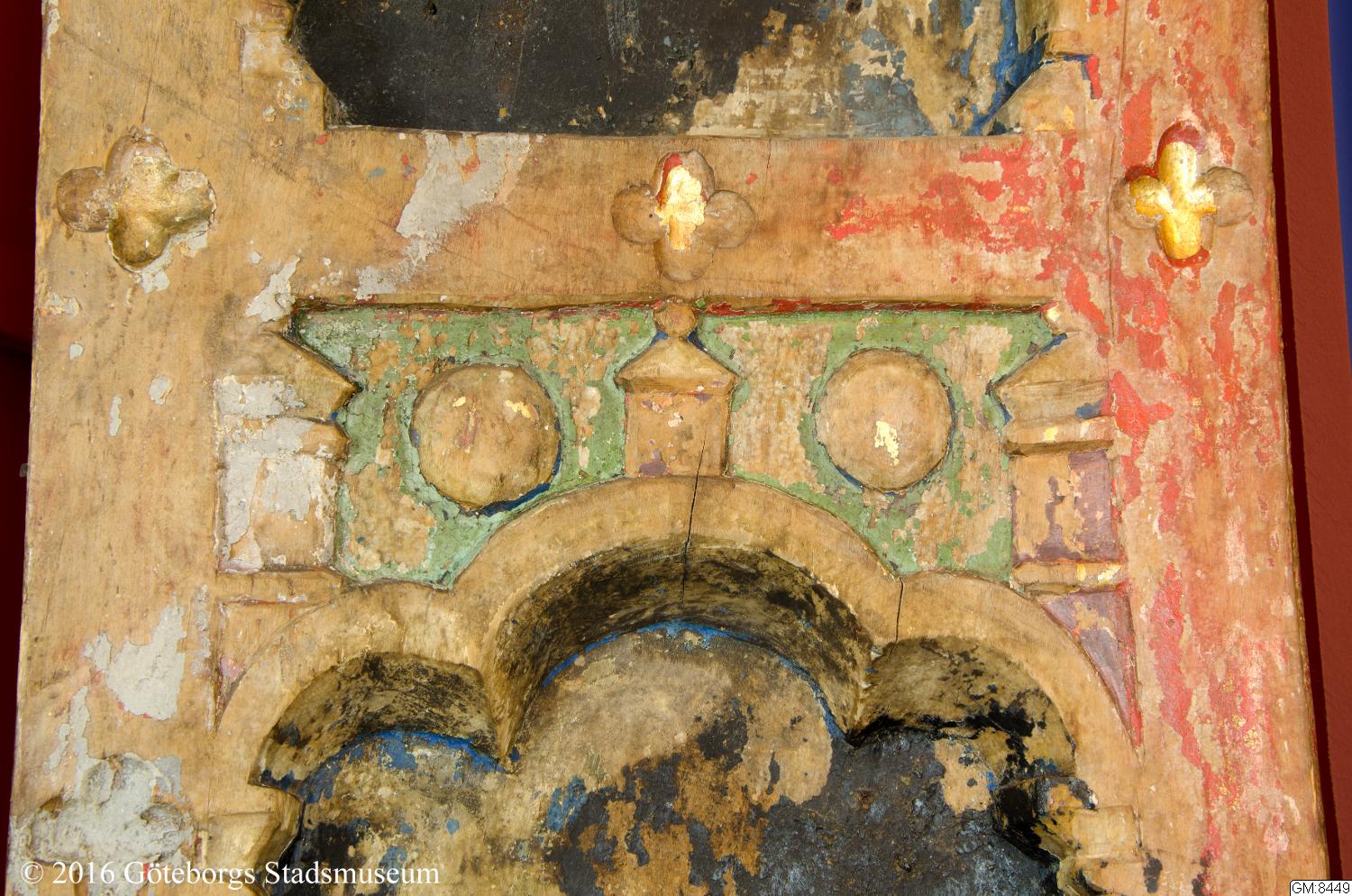 Delar av Mariaskåp i trä: a&b=dörr; c&d=list, längre; e=list, kortare; f= bladornament g=bladornament, fragment. Dörrar: Skurna i ett stycke som överst avslutas i en trefasad rundbåge. Tre anslutande fält i varje dörr samt snidad dekor i form av försänkta korsblommor.