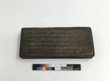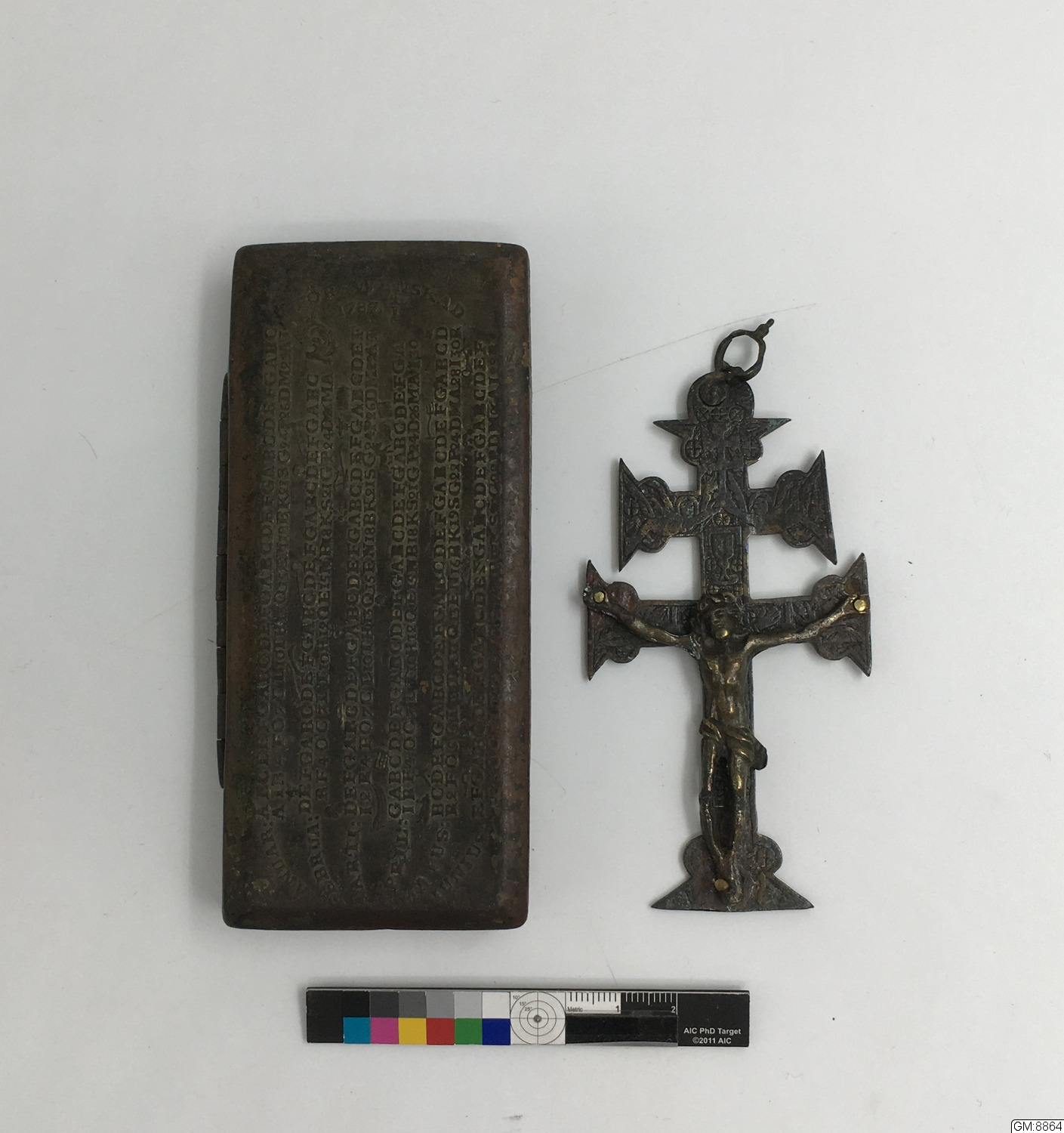 "Snusdosa (a) af kopparlegering(?), 1780-tal, med däri innerliggande krucifix (b) af messing (?), trol. från 1600-talet samt ett ryskt (?) kors (c) av förgyllt koppar af oviss ålder. Funna av säljaren under en stentrappa på hans gård vid omläggning af denna trappa. (från liggaren)