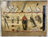 • består av a)väggbonad från Dagsnäs, köpt från R Mally, och b)skrin av ek, från Svenljunga, köpt från P. Mally