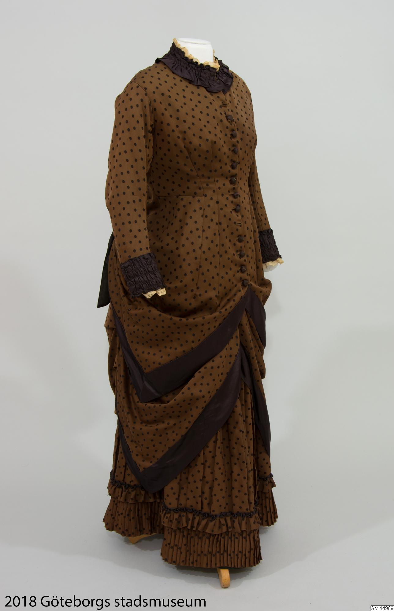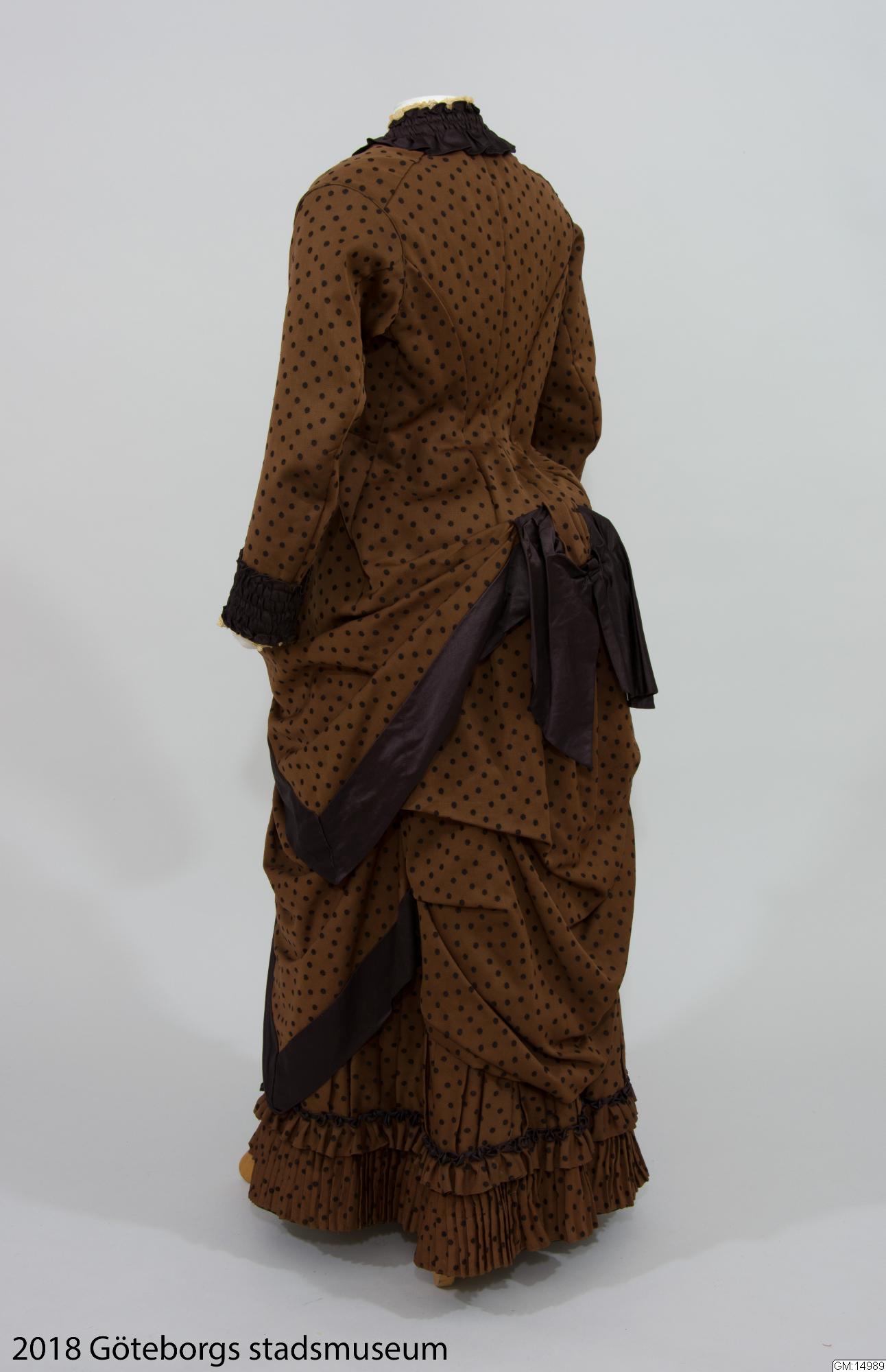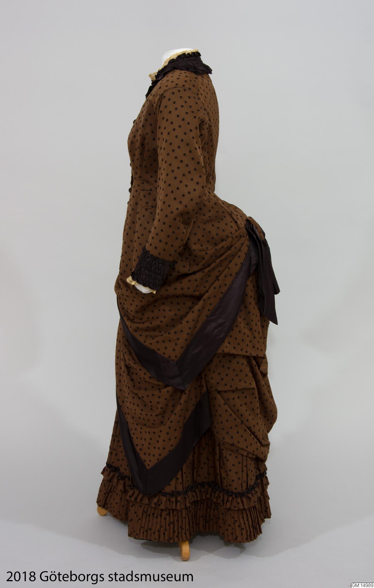 Damklänning i småpricknigt brunt ylle bestående av liv och kjol. Klänningen har burits tillsammans med turnyr men kjolvidden nedtill är ändå relativ snäv. Livet knäpps med en rad klädda knappar mitt fram och är draperat och går ner över kjolen. Dekorerad med lagda veck, draperingar och band i mörkbrun sidenatlas. Från katalogkort: Klädning av brunt ylle med invävda mörkbruna prickar. Foder av brun lärft, garnering med mörkbrun atlas och spetsrysch i hals- och ärmkant. Kjol längd fram: 93 cm, bak: 98 cm, Jacka längd fram: 100 cm, bak: 83 cm, ärmlängd: 52 cm.