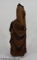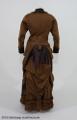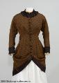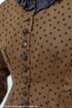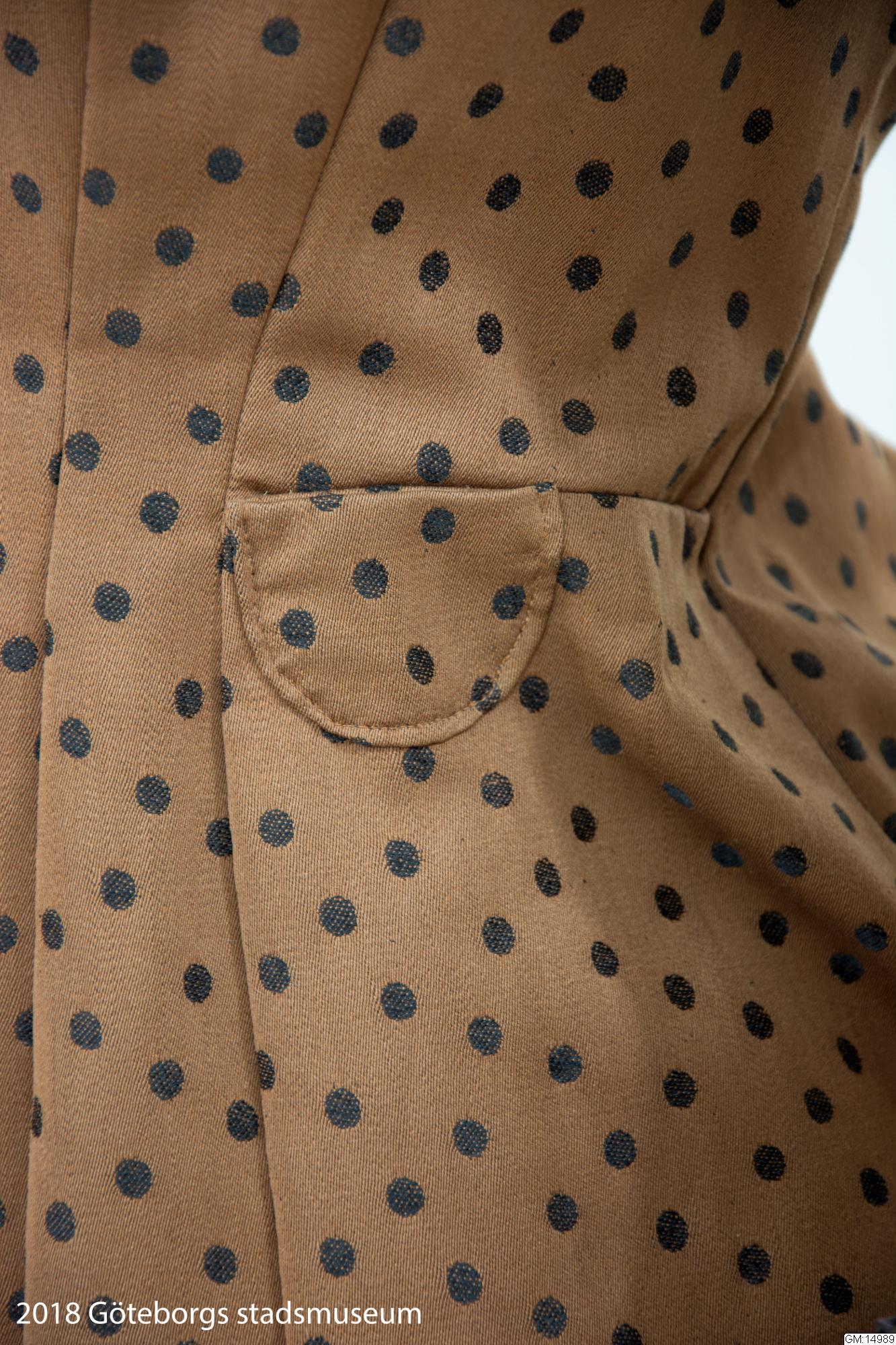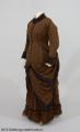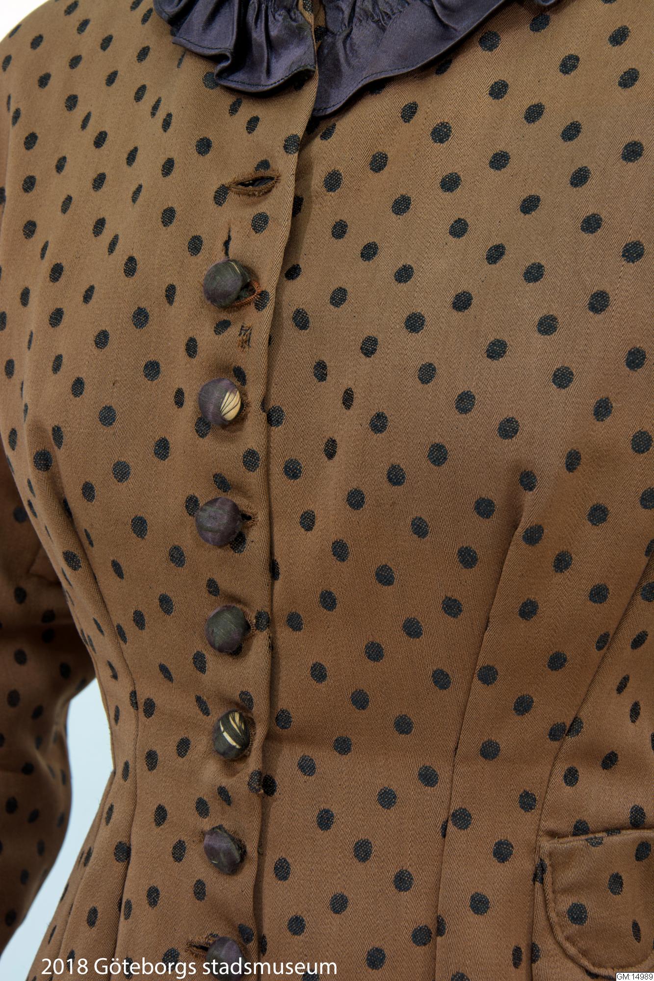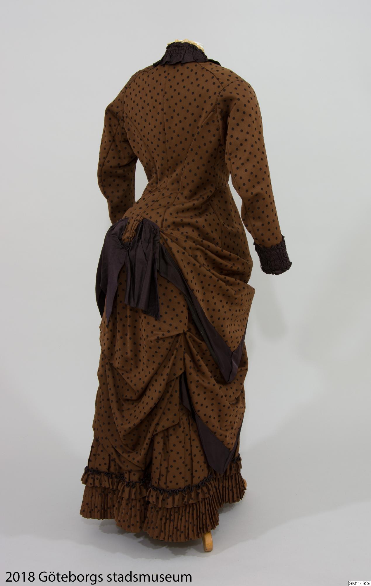 Damklänning i småpricknigt brunt ylle bestående av liv och kjol. Klänningen har burits tillsammans med turnyr men kjolvidden nedtill är ändå relativ snäv. Livet knäpps med en rad klädda knappar mitt fram och är draperat och går ner över kjolen. Dekorerad med lagda veck, draperingar och band i mörkbrun sidenatlas. Från katalogkort: Klädning av brunt ylle med invävda mörkbruna prickar. Foder av brun lärft, garnering med mörkbrun atlas och spetsrysch i hals- och ärmkant. Kjol längd fram: 93 cm, bak: 98 cm, Jacka längd fram: 100 cm, bak: 83 cm, ärmlängd: 52 cm.