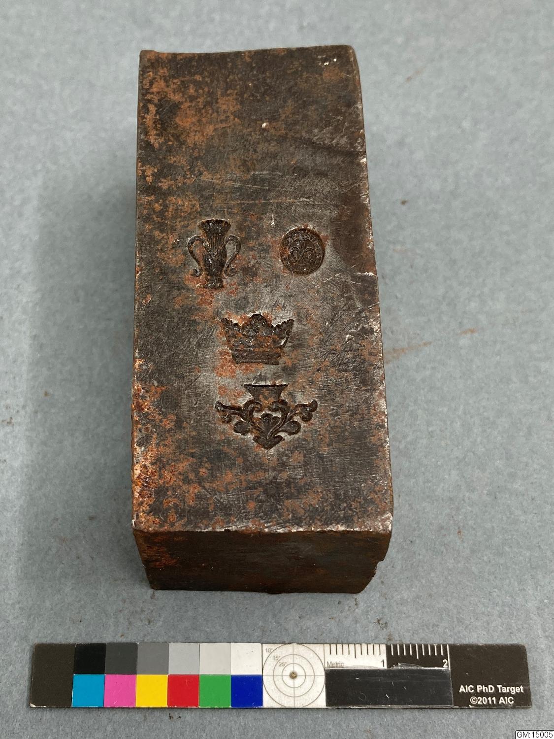 • metallstans med olika former på 3 sidor. På en sida syns en mall av Queens Pattern bestickmodell, skapad till drottning Victoris ära på 1850-talet. På en annan sida finns lilla riskvapnets krona tills... Visa hela