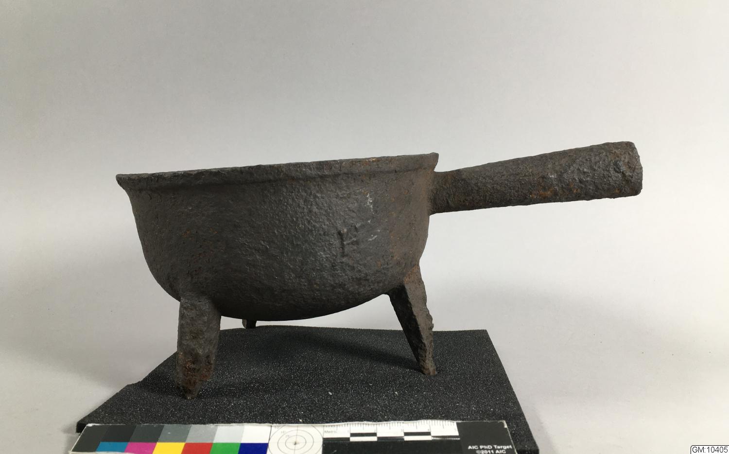 • "Gryta på tre ben med handtag, av järn, stämplad HF (Hellefors)"