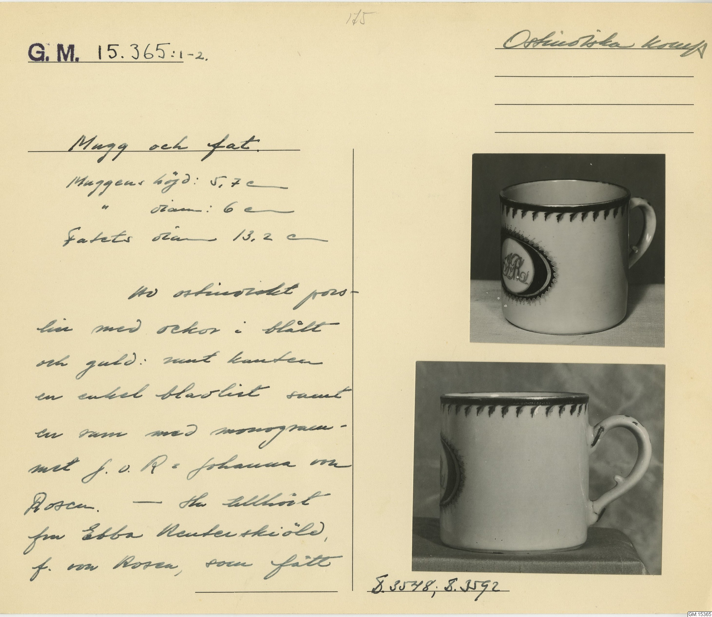 I museets samlingar finns tre kopparmed fat med monogram JvR på. Vid auktion på Stockholms auktionsverk den 1/10 2025 finns två mattallrikar med samma monogram till försäljning.