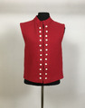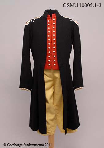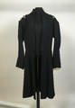 1: Svart rock i yllekläde med inspiration från manlig folkdräkt. Rockens liv är figursytt och skörtet är utsvängt och har två lagda veck i ryggen. Rocken har ståkrage och ärmsluten har en isydd lösmanschett i vit viscose. Knäppning saknas. Påsydda applikationer på rygg och axlar i gult, rött, svart och vitt yllekläde i folkloristisk stil. Märkning: Etikett från Göteborgsoperan med otydlig märkni...