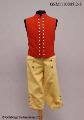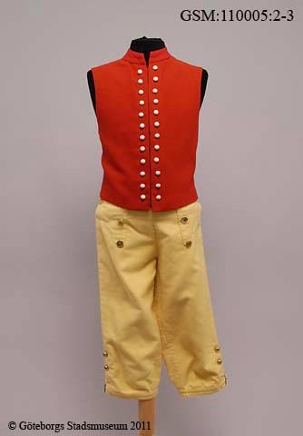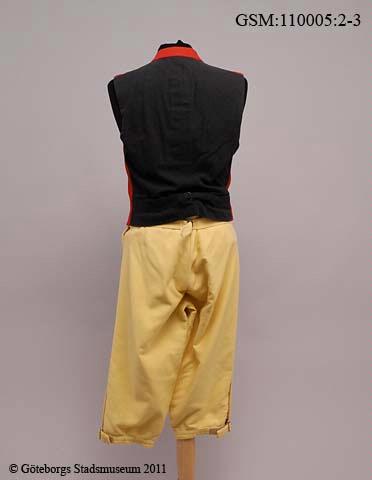 1: Svart rock i yllekläde med inspiration från manlig folkdräkt. Rockens liv är figursytt och skörtet är utsvängt och har två lagda veck i ryggen. Rocken har ståkrage och ärmsluten har en isydd lösmanschett i vit viscose. Knäppning saknas. Påsydda applikationer på rygg och axlar i gult, rött, svart och vitt yllekläde i folkloristisk stil. Märkning: Etikett från Göteborgsoperan med otydlig märkning. Längd mitt bak: 114 cm, vidd nedtill: 229cm. Etikett från Kungliga operan: Fadern, Rambe, F. sonen -03. 2: Knäbyxor i ljusgul bomull i folkdräktsmodell. Knäppning med två knappar/knappar i varje sida och med sex dekorativa runda mässingsknappar påsydda i två rader vid höften. Slejf i ryggen med oxiderat metallspänne. I midjan finns även påsydda knappar som troligen hållit ett par hängslen, dessa saknades dock vid förvärvstillfället. Byxbenen knäppes under knäna med slejf och dolt kardborreband med ett påsytt dekorativt mässingsspänne. Sprund vid bensluten som knäppes med tre runda mässingsknappar/knapphål. Benlämgd: 77cm. Märkning: Etikett från Göteborgsoperan med otydlig märkning. Etikett från Kungliga operan: Rambe, F. sonen -03. 3: Väst i rött yllekläde med ståkrage. Ryggstycke i svart bomullskypert med slejf med spänne i midjan. Dold knäppning mitt fram med hyskor/ hakor, dekorerad med 12 par runda prydnadsknappar i vit plast.Längd mitt bak: 53 cm. Märkning: Etikett från Göteborgsoperan med otydlig märkning. Etikett från Kungliga operan: Rambe, F. sonen -03. 4: Hög hatt i svart filt med svart hattband. Märkning: Med tusch på textiltejp: Howard, förl. sonen -97 5 a-b: Randiga strumpor i vitt och rosa. Höjd: 57cm. Märkning: 3 st på textilband; "I. Howard, f. l. sonen -97", "Rambe, fadern -01", "Rambe, f. sonen -03"