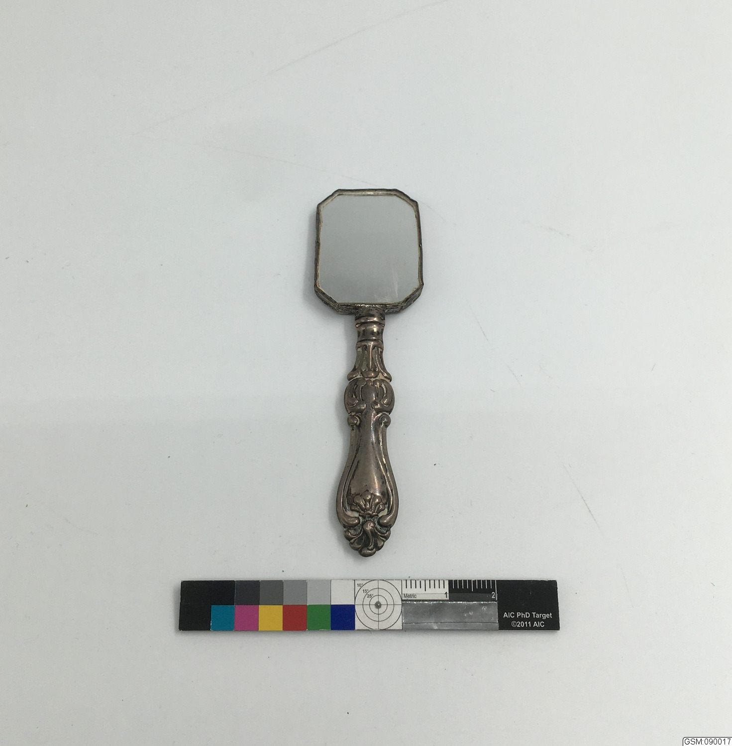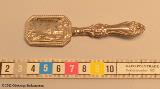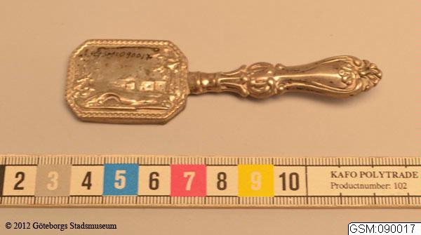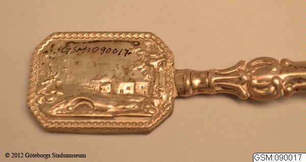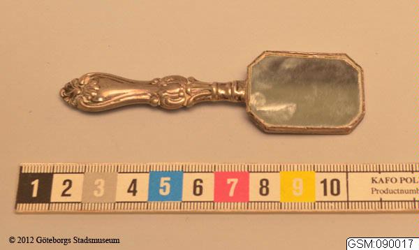 liten fickspegel av silver, scen av pastoralt landskap på frånsidan av spegeln, skaft i Olgamodellen. Olga är en benämning på en matsilveruppsättningsmodell vilken började att tillverkas i Sverige, efter utländsk förebild, ca 1830 och vilken alltjämt produceras.