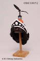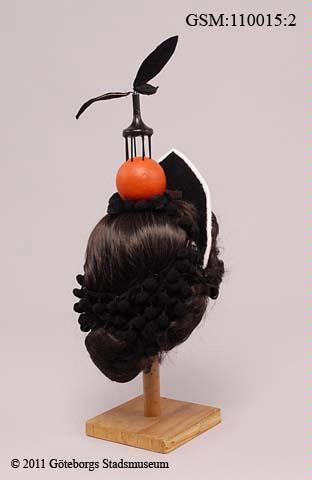 1a: Vinröd klänning i taft bestående av liv och påsydd kjol. Livet är figursytt med isydda skenor och kort ärm kantad med vit spets. Livet är kantat i vitt blankt tyg i nederdel som mitt bak bildar ett rektangulärt skört som går ner 22 cm över kjolen. Ryggstycket är delvis i svart och dekorerat med tio påsydda förgyllda löv i läder och vid ryggslutet två vita plastknappar. Livet knäppes mitt fram med hyskor och hakar men knäppningen döljs av ett bröststycke i blankt vitt som går upp mot halsen och även bildar en ståkrage. Kragen är kantad med svart spets och bröstlappen är kantad med vit spets, är dekorerad med en blomma och snedställda band i rött i applikationsteknik och horisontella påsydda band i svart spets. Kjolen är i vinröd taft med infälld front i svart taft. Fronten är dekorerad med cirkelornamentik i rött och kantad med vit spets och två vertikal rader av påsydda förgyllda löv i läder. Kjolen har en fast underkjol i tyll med en volang i nederkant av stärkt tyll i flera lager som ger volym åt kjolen. Underkjolen är kantad med vit spets som är synlig under den vinröda kjolen. Längd: 123 cm, ärmlängd: 26 cm. Märkning:Etikett från Göteborgsoperan: otydlig och med tusch på bomullsband: "Lind af Hageby, 3.e tavlan, förlorade sonen -03". 1b: Lös krage med rundbågig yttre kant med spets spänd över metallstomme. Har suttit fast på klänningslivets nack- och skulderparti. Där sömmarna som hållit fast kragen har suttit finns spår kvar i form av vita grova trådar, samt spår av sömmar. 2: Peruk i i brunt syntethår uppsatt med löst tvinnat sidohår och en samlad knut i nacken. Peruken är prydd med ett diadem i svart och vit tyg. Mitt på huvudet står ett torn med ett rött klot med en svart hög prydnad på prydd av svarta blad i tyg. Peruken har även prydnader av svarta tofsband. I nacken sitter ett brunt resår. I nacken sitter en företagslapp med "elura, blend, modacrylic fiber, USA & Japan" Personmärkning saknas.