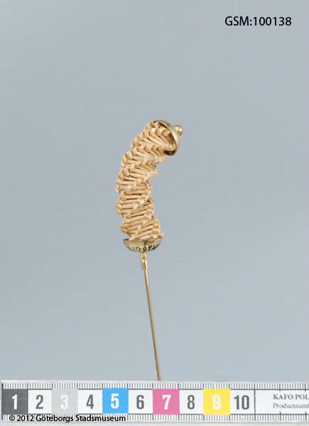 • Hattnål , nål och skålformad hylsa av gulmetall i den senare är en lätt böjd del av spiralflätad halm infäst även toppenav halmen pryds med en skålformad del av gulmetall