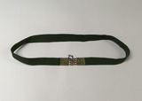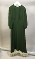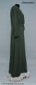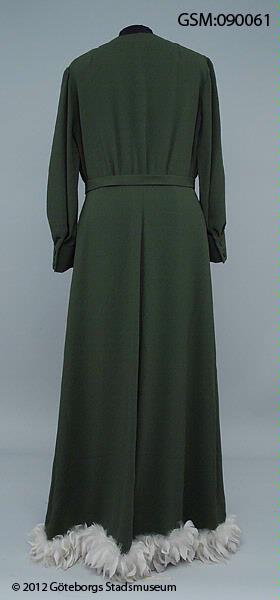 :1 klänning :2 skärp aftonklänning i grön yllecrepe, lång ärm, rund hals med smalt formad kant, klädda knappar, två i ärmen i var manschett, fyra framtill, skärp av samma tyg med mässingsspänne, nederfållen kantad av vit fjäderbesättning. Sydd hos Wallin, Göteborg.