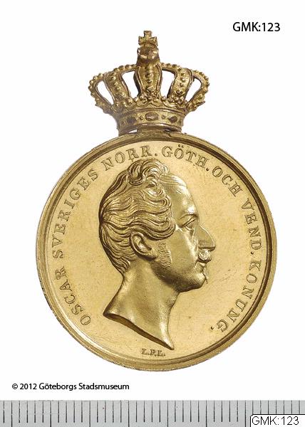 För medborgerlig förtjänst, 8 storleken i guld. Ursprungligen bars medaljen i en guldkedja, fäst i en ring som löpte genom kronans riksäpple, kring halsen. Kedjan har dock aldrig ingått i museets samling.