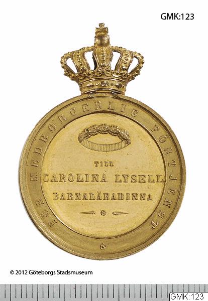 år 1858 belönades mamsell Lysell med denna medalj för medborgerlig förtjänst. Om överlämnandet av medaljen berättas i protokoll av den 28 juni 1858. "Derefter öfwerlemnades af Herr StatsRådet och Commendören Fåhraeus i närwaro af samtliga skolbarnen samt åtskilliga Herrar och Damer hwilka af Direktionens ordförande blifwit till denna högtidlighet inbjudne, åt skolans Förestånderska och första Lärarinna, mamsell Carol. Lysell den belöning - en medalj i guld av 8de storleken - Som Kongl. Maj:t i nåderfunnit for godt att, för 43 års trogen och nitisk werksamhet i denna skola, henne tilldela - jemte en widfogad halskedja av guld, bekostad av ledamöterne af skolans Direktion. Herr Statsrådet tolkade härwid wigten och betydelsen af det mödosamma kall, som har till föremål det yngre slägtets uppfostran och bildning, samt lyckönskade mamsell Lysell till den sällsynta framgång, hwarmed hon så länge innehaft och ännu wärdigt motswarade det maktpåliggande fortroendet att förestå en Stiftelse, som, om den ock i hänseende till sin uppkomst kunde kallas enskild, likwäl i det allmänna synbarligen spridt mycket gagn; hwarjemte herr Statsrådet i de förbindligaste ordalag betygade sin aktning för de damer, hwilka genom sina frikostiga bidrag icke blott fortfarande upprätthållit denna lika gagnande som behöfliga inrättning, utan ock på enahanda sätt betryggat dess framtida bestånd, - och då han nu wore en tolk af de mångas tacksamhet, hwilka under Mamsell Lysells sorgfälliga handledning wunnit sin uppfostran, skattade han sig lycklig att hafwa kunnat witsorda en förtjenst, lika werklig, som hittills från den allmänna uppmärksamheten undangömd, och att nu se densamma genom detta wedermäle af Kongl. Maj:ts nåd uppmärksmmad och belönad. De församlade Skolbarnen undfägnades av Direktionens Ordförande Fru Biskopinnan Bruhn och deltogo i den skål, som af Fru Biskopinnan föreslogs för deras wälförtjenta och wördade Lärarinna Mamsell Lysell."
