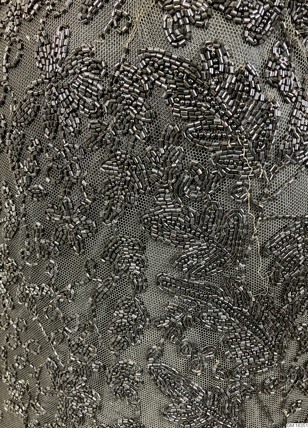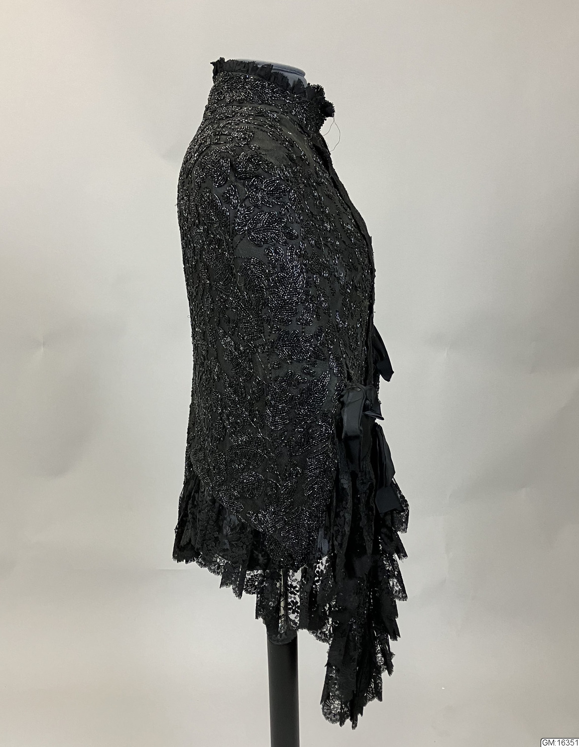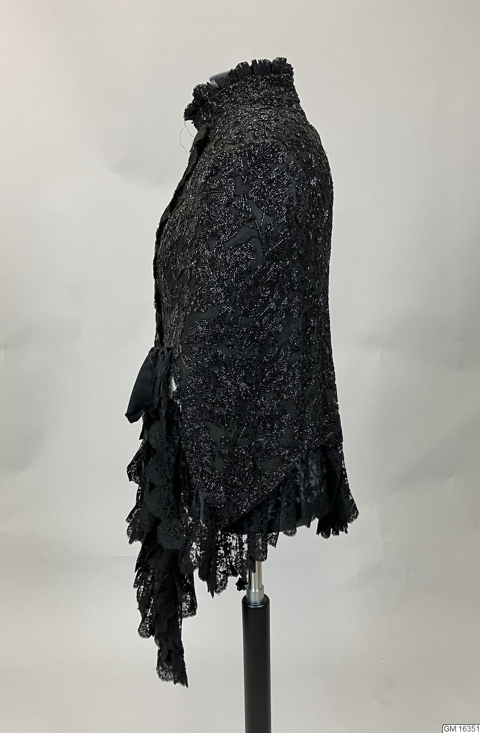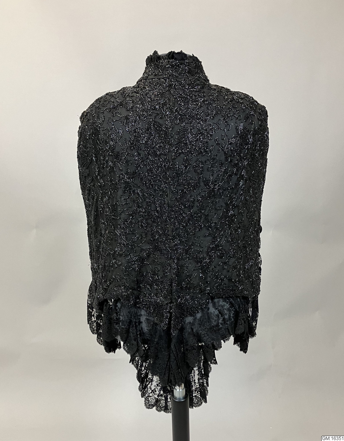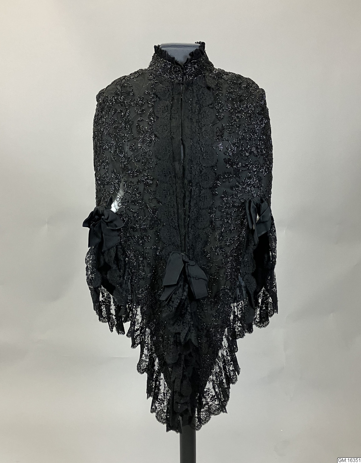 • Cape/pellerin av anäv modell av svart tyll med spets och svarta pärlbroderier. Pellerinen går ner mitt fram i två spetsar, hög krage och mnäppning mitt fram. Fodrad med svart siden.