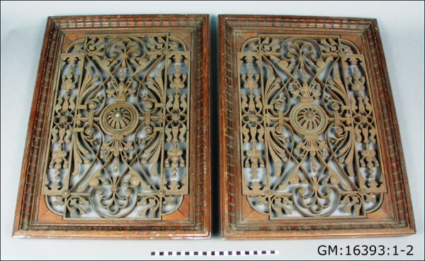 kommer från Fürstenbergska palatset som testamenterades till Göteborgs stad. Huset såldes och inredningen i galleriet tillfördes museisamlingarna. Dessa ställdes ut i Ostindiska Huset och flyttades sedan till det nybyggda Konstmuseet 1923. Dessa - tillsammans med ett trappräcke (GM:16392) - lämnades kvar i Historiska msueets samlingar och infördes i katalog 1936.