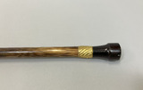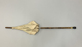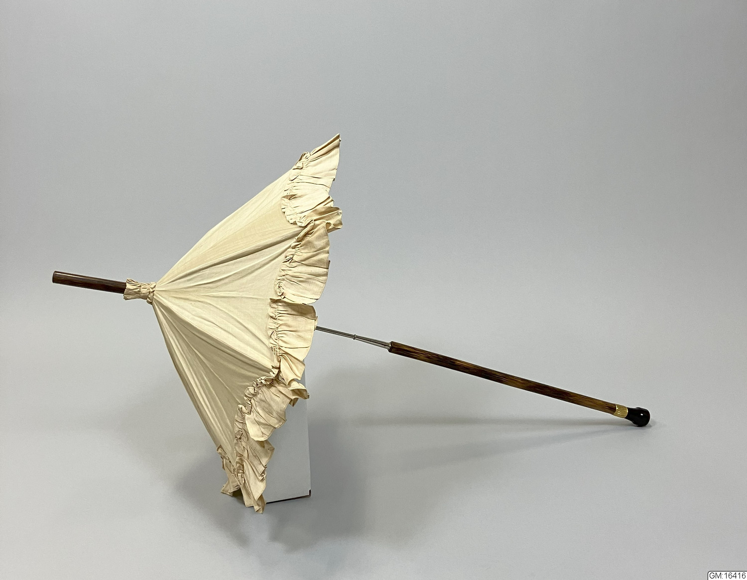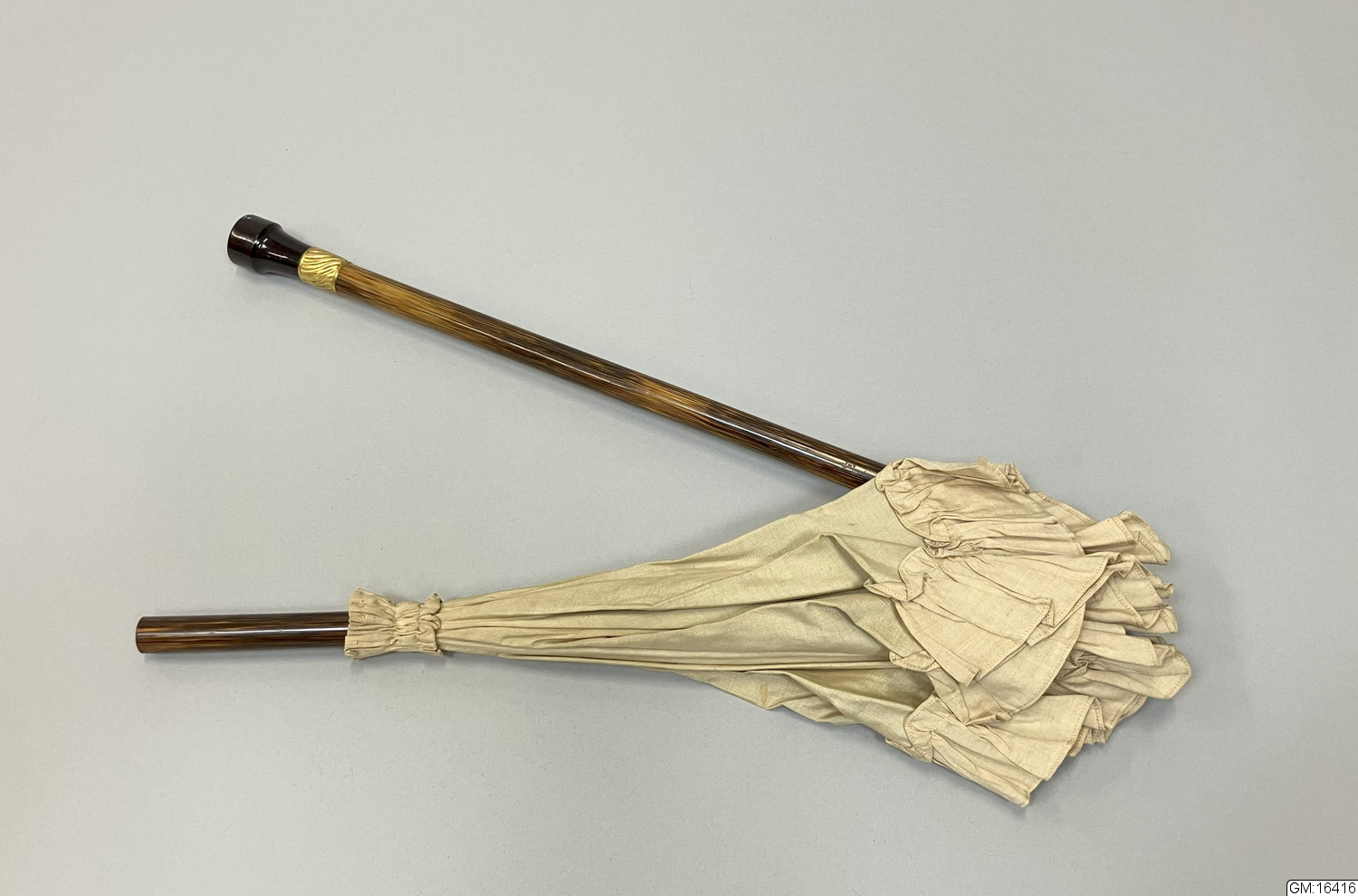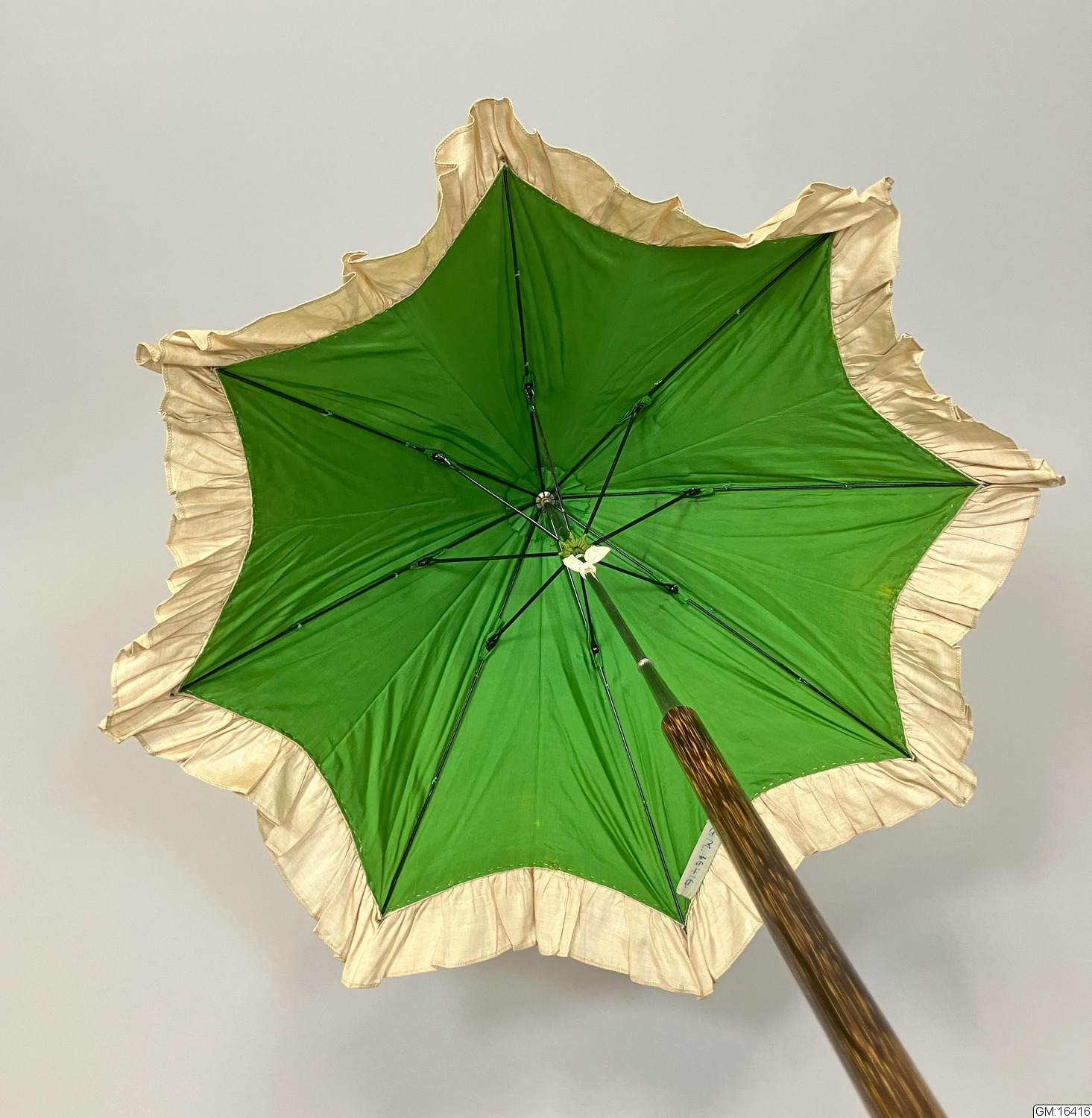 • Hopvikbart parasoll i ljusbrunt siden med påsydd rynkad volang i ytterkanten. Stomme i metall och skaft i trä med knapp i bärnsten guldfärgad metall. Fodrad med klargrönt siden. Skaftet går att vika ihop på mitten.