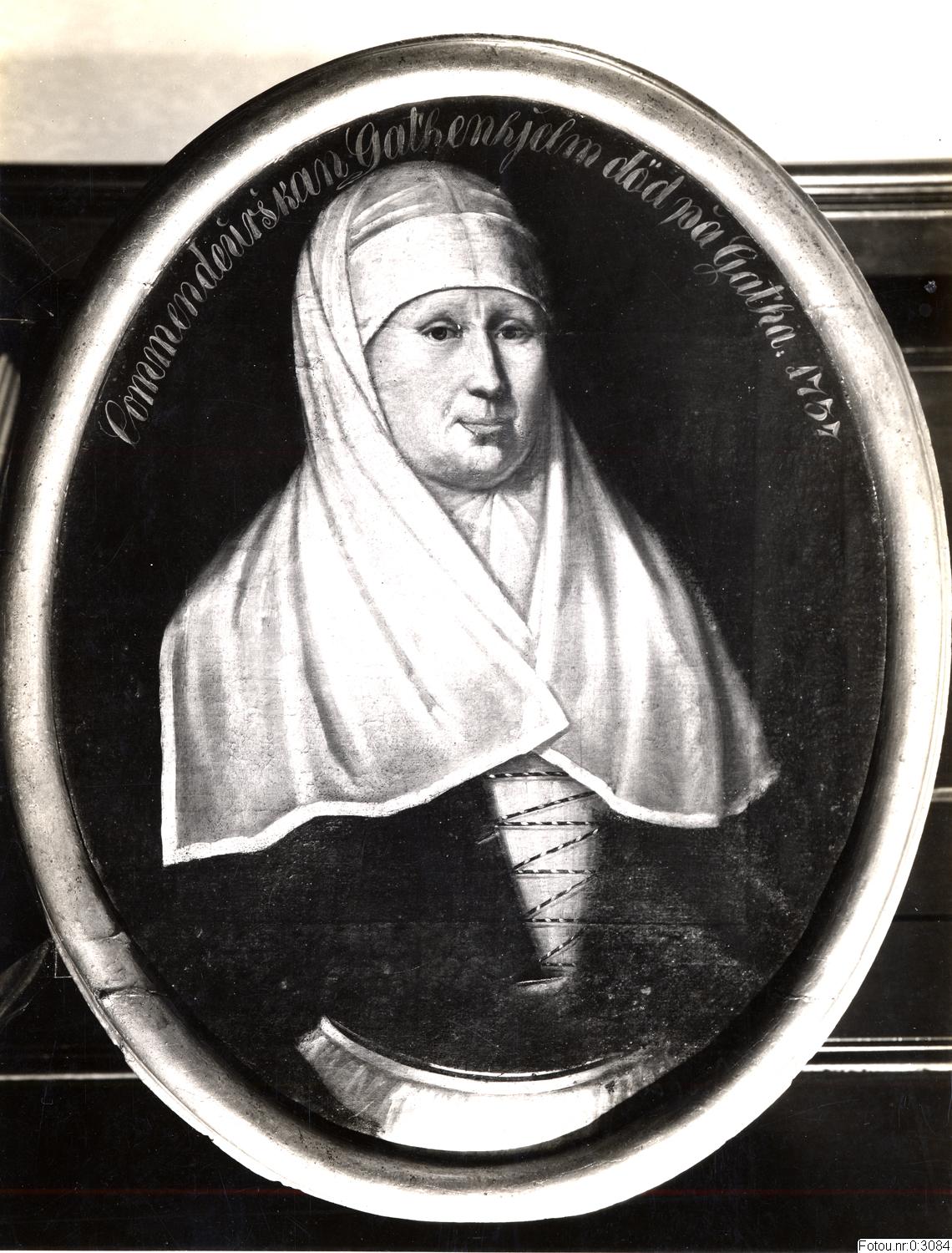 Foto av porträtt i olja föreställande Christina Larsdotter, gift med Anders Börjesson Gathe. Född 1654-09-11, död 1735-08-10. Dotter till Lars Matsson, kvarnägare i Hjälm i Fjärås socken och mor till Christen, Lars och Anna Thalena Gathe. Enligt vissa uppgifter föreställer porträttet Ingela Hammar, 1692 - 1729, maka till Lars Gathe/Gathenhielm. men det är trolgitvis vis fel. Tidpunkt och plats stämmer inte med påskriften på tavlan.