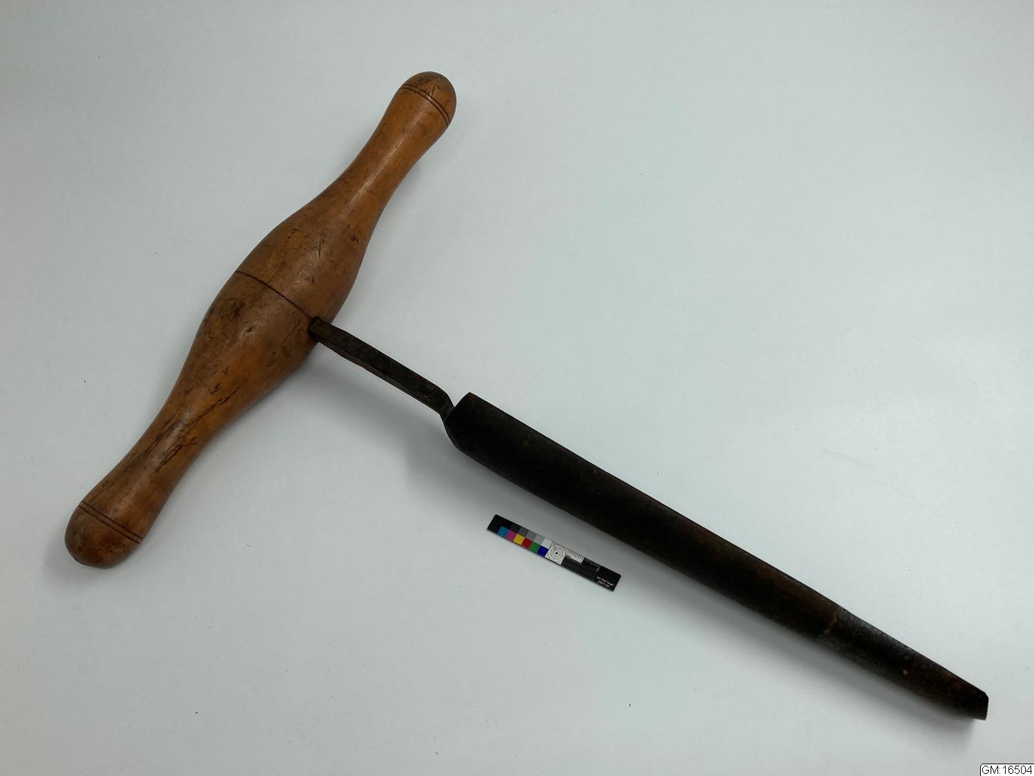• Träborr eller "navare" med handtag av trä. Borret är 31 cm långt och urholkat (skålformat)