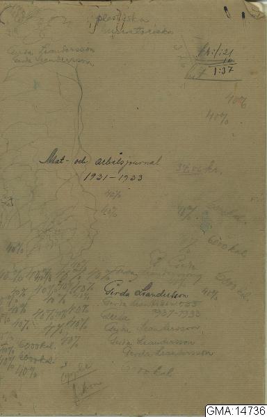 kassabok inslagen i brunt bokomslagspapper, innehållande uppgifter om inköp, arbetsuppgifter mm. Innehåller även ett antal lösa (ibland hophäftade) blad: Fysikprov d. 15 nov 1932 (2 x 2 s, kopierat) Examenschema vid Göteborgs skolköksseminarium 1933 (1 bl) Arbetsplan för Kungsladugårdsskolans skolkök: Torsdagen 18 maj 1933 (1 dubbelsidigt pappersark) Vårterminen 1933 (3 dubbelsidiga pappersark, ...