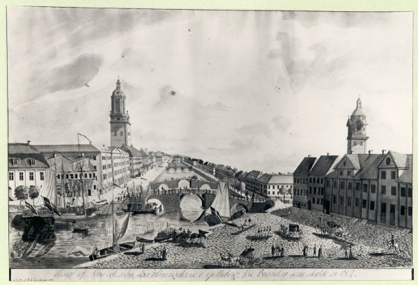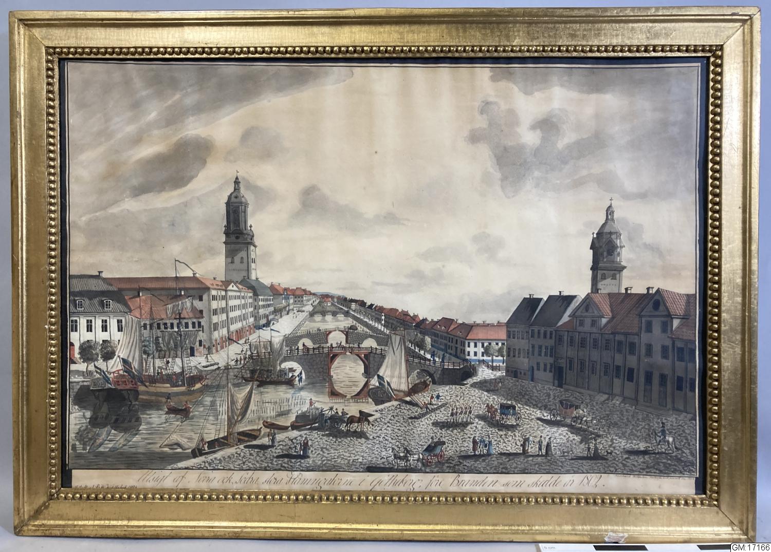 • Stora Hamnkanalen med närmaste grannskap. "Utsigt af Norra ock Södra stora Hamngatorna i Götheborg, före branden, som skedde år 1802."