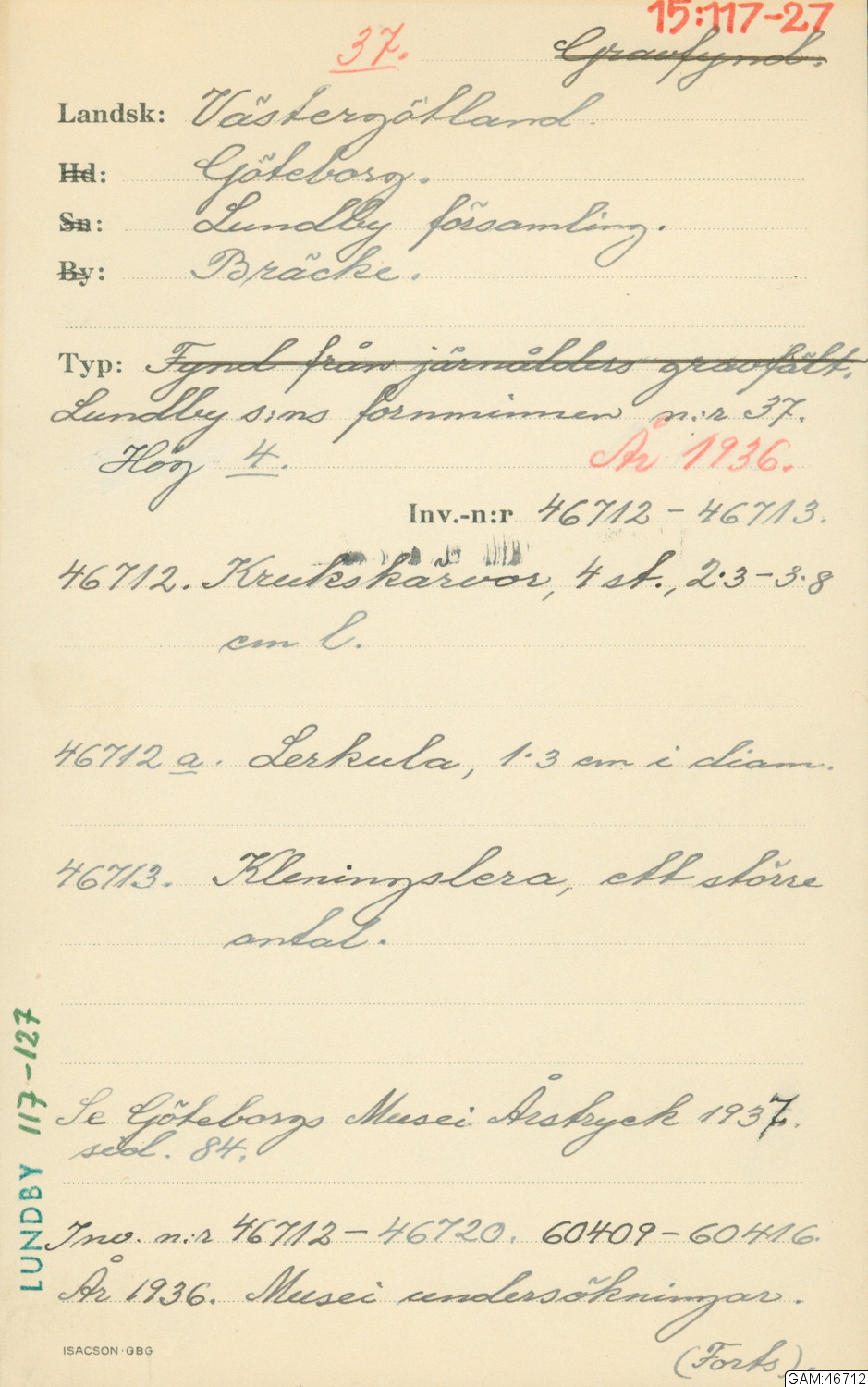 Hittad 1936-05 i Bräcke, Lundby, Västergötland, Sverige, Europa av Niklasson, Nils, 1890-1966.