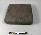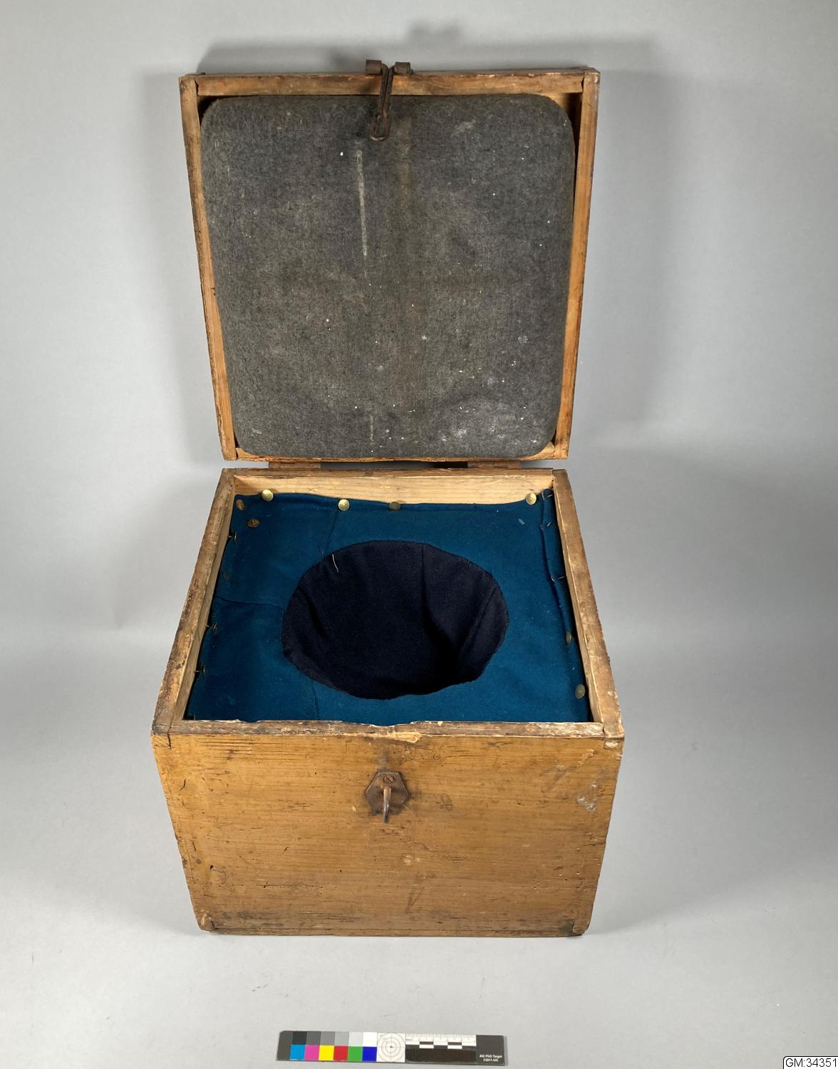 Koklåda med lös dyna och beslag av järn. 1:) Koklåda av trä med fastsittande lock, målad i gråbrunt. Klädsel inuti av svart och grönblå filt med runt hål med plats för kastrull. 2:) Lös grå dyna av stoppad grå flanell.