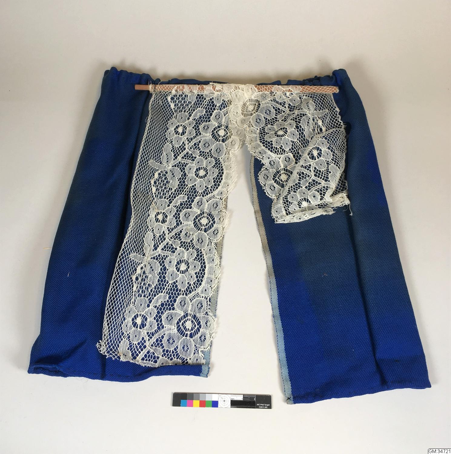 • Gardiner för dockskåp i blå ylletwills med undergardiner av vit spets uppsatt på skena. (otydligt)