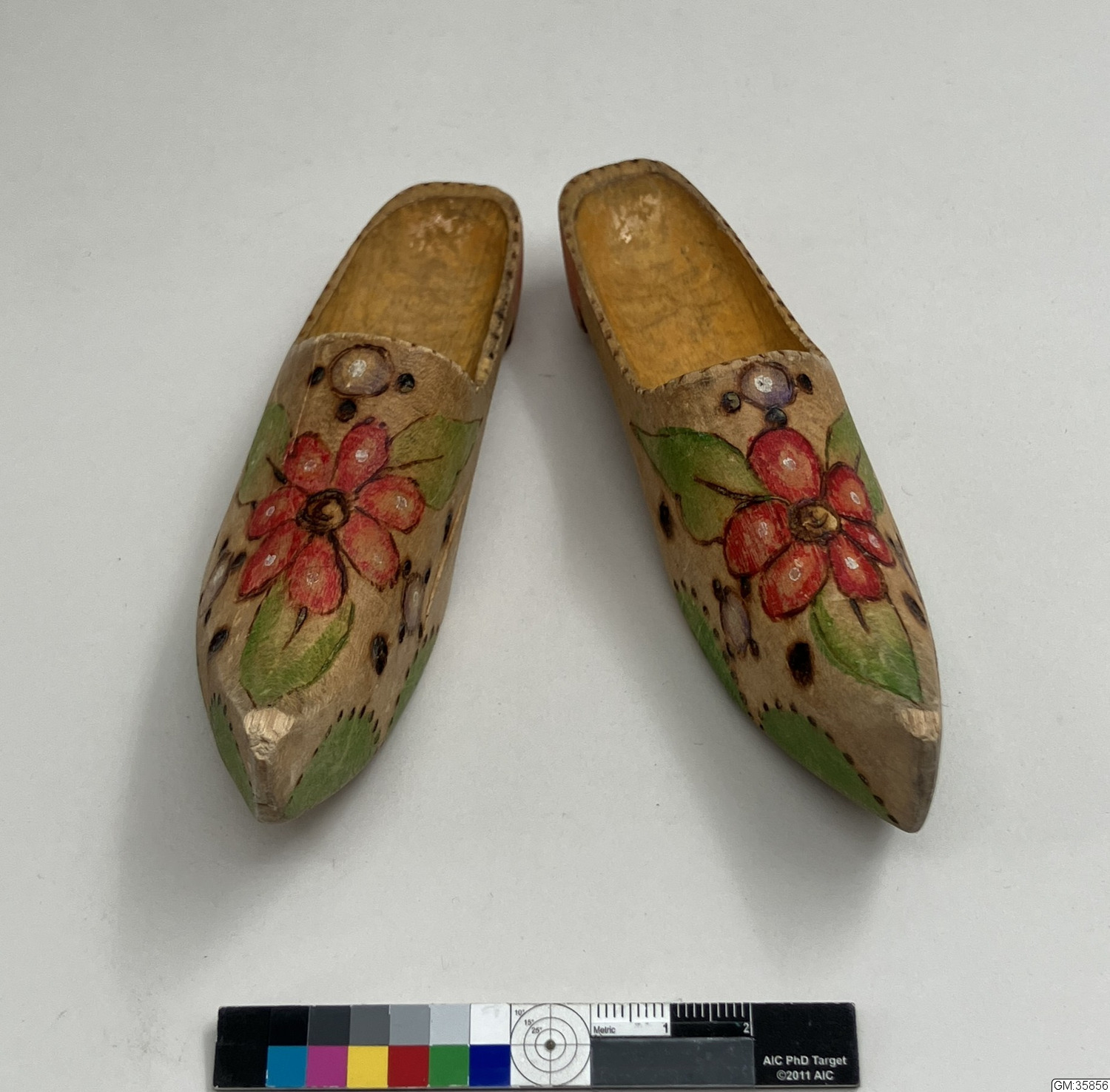 • Ett par träskor med spetsig tå i miniatyr med prickar i glödritning och målning i rött och grönt föreställande blommor och blad. Rödmålade klackar. Den högra är märkt Axel.