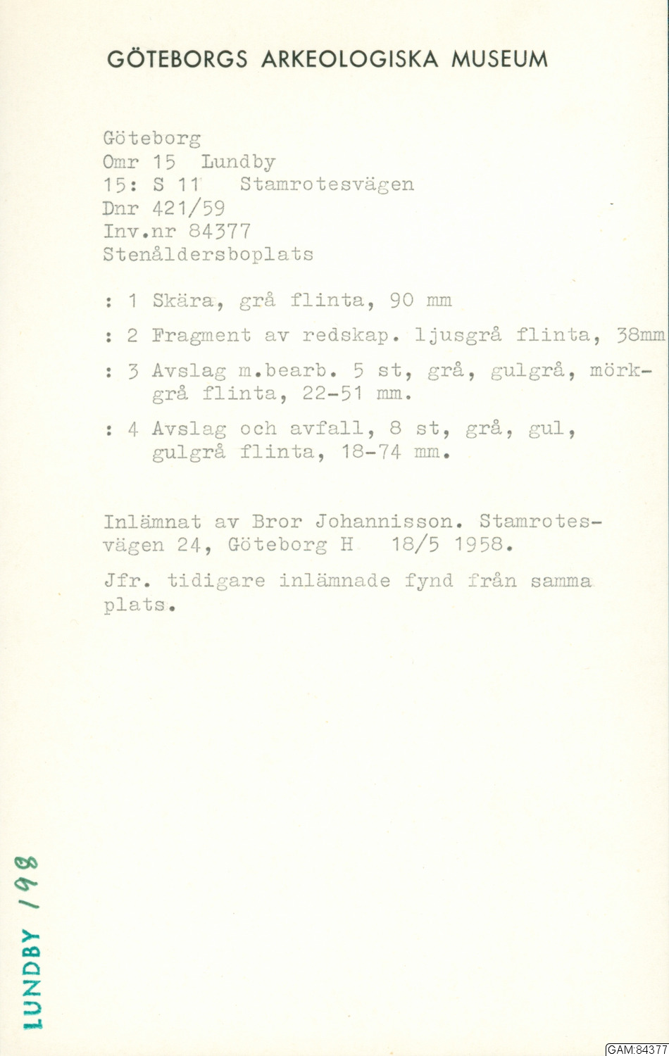 • Hittad 1958-05-18 i Stamrotesvägen, Lundby, Göteborg, Västergötland, Sverige.