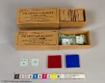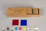 Två askar med räknelappar. Ursprungligen har det också funnits en räkneplatta, men enligt katalogen har den kommit bort. Den ena asken innehåller lappar med tal på, den andra innehåller tvåfärgade brickor.