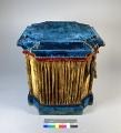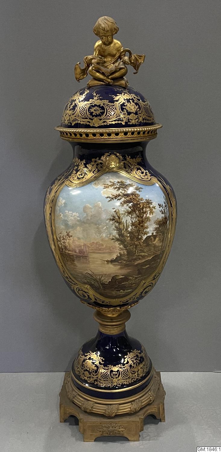 • Stor vas av porslin med lösa beslag av metall med tillhörande plyschklädda pedistaler. Del av ett par med GM:1847.