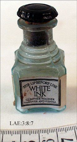 "Stir up before use. White ink, Günther Wagner, Hanover and Vienna". (Denna text finns också på franska och tyska på var sin etikett).